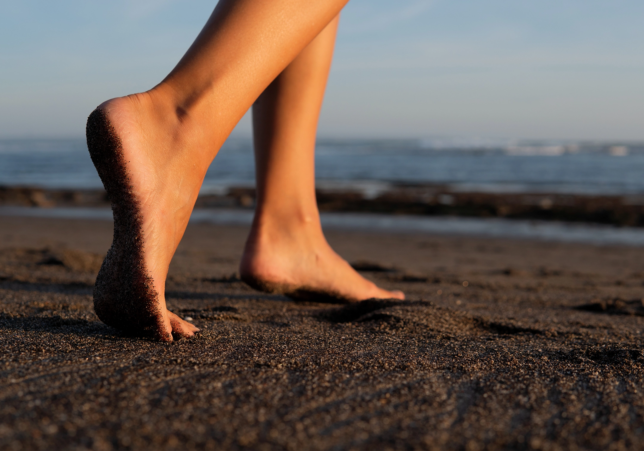 Appliquez une crème SPF50+ pour des pieds exposés au soleil, réappliquez toutes les 2 heures. Choisissez des formules non grasses qui préviennent des taches brunes et des cancers cutanés podaux.