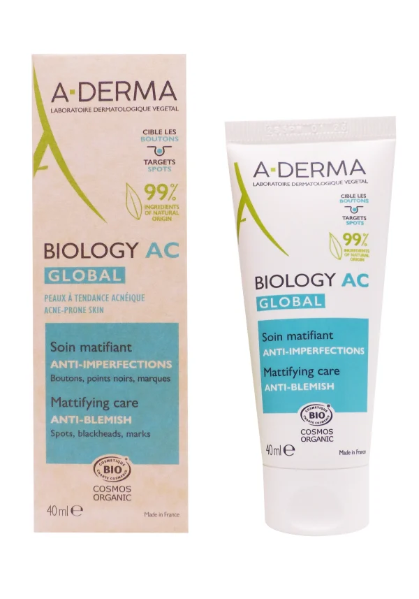 A-Derma Biology AC Global Soin Matifiant Anti-Imperfections 40 ml est un soin dermatologique complet spécialement formulé pour corriger, apaiser et équilibrer les peaux mixtes à grasses à tendance acnéique. Développé par le Laboratoire Dermatologique A-Derma, ce soin réunit efficacité anti-imperfections, hydratation durable et matité longue tenue, tout en respectant la sensibilité naturelle de la peau.
