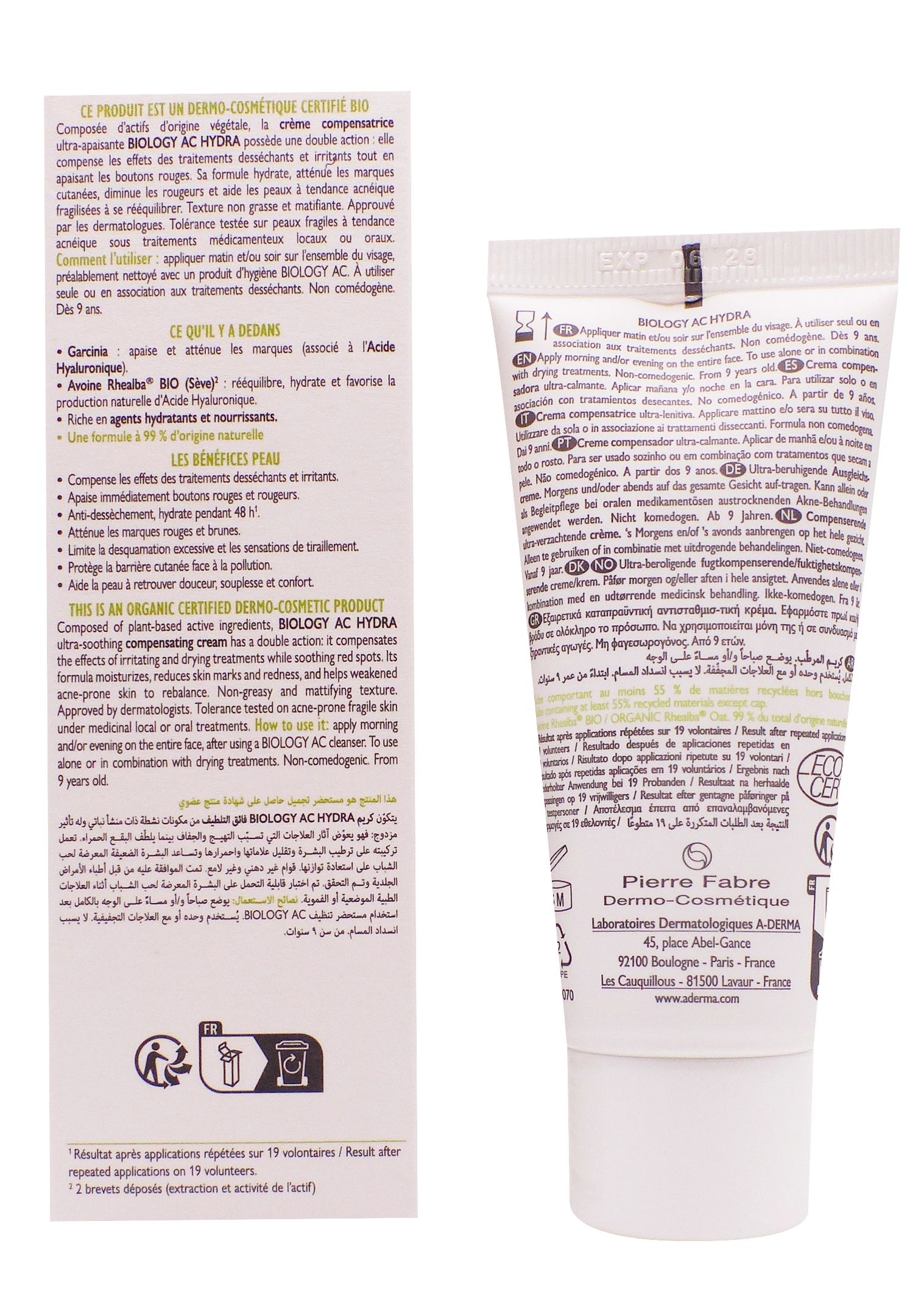 La formule est composée à 99% d’ingrédients d’origine naturelle, sans silicone, sans huiles minérales, sans ingrédient d’origine animale, pour répondre aux attentes des consommateurs en quête de soins bio et clean en parapharmacie. La crème A‑Derma Biology AC Hydra s’intègre facilement dans une routine de traitement dermatologique, en complément des soins prescrits par le médecin (rétinoïdes, traitements locaux asséchants, etc.).