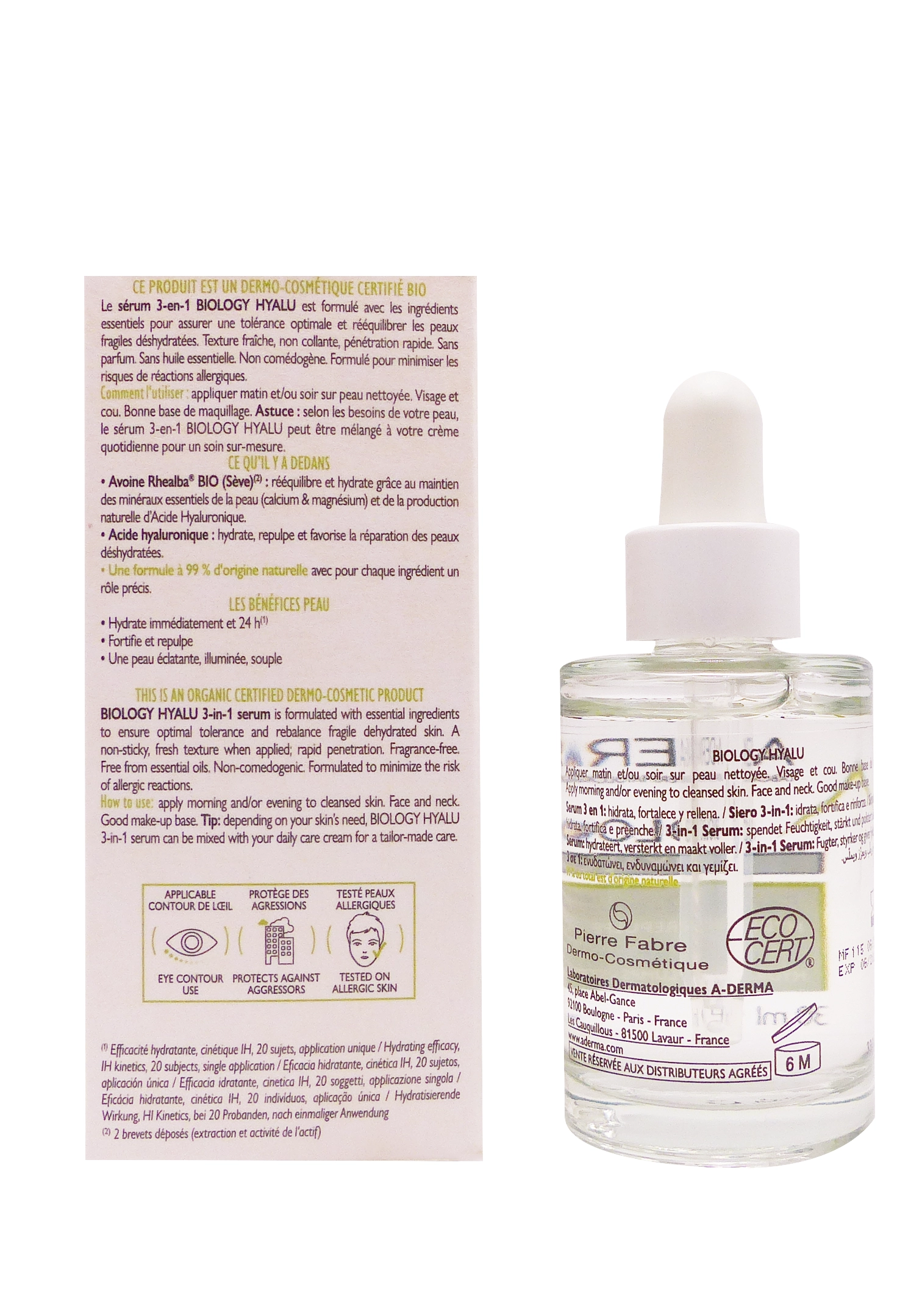 Aderma Biology Hyalu Sérum 3 en 1, 30 ml hydrate, répare et protège la peau grâce à l’acide hyaluronique et l’Avoine Rhealba®, pour une peau souple, confortable et résistante aux agressions extérieures. Formulé sans parfum, sans alcool et sans colorant, il convient aux peaux sensibles et peut être utilisé matin et soir pour un effet optimal.