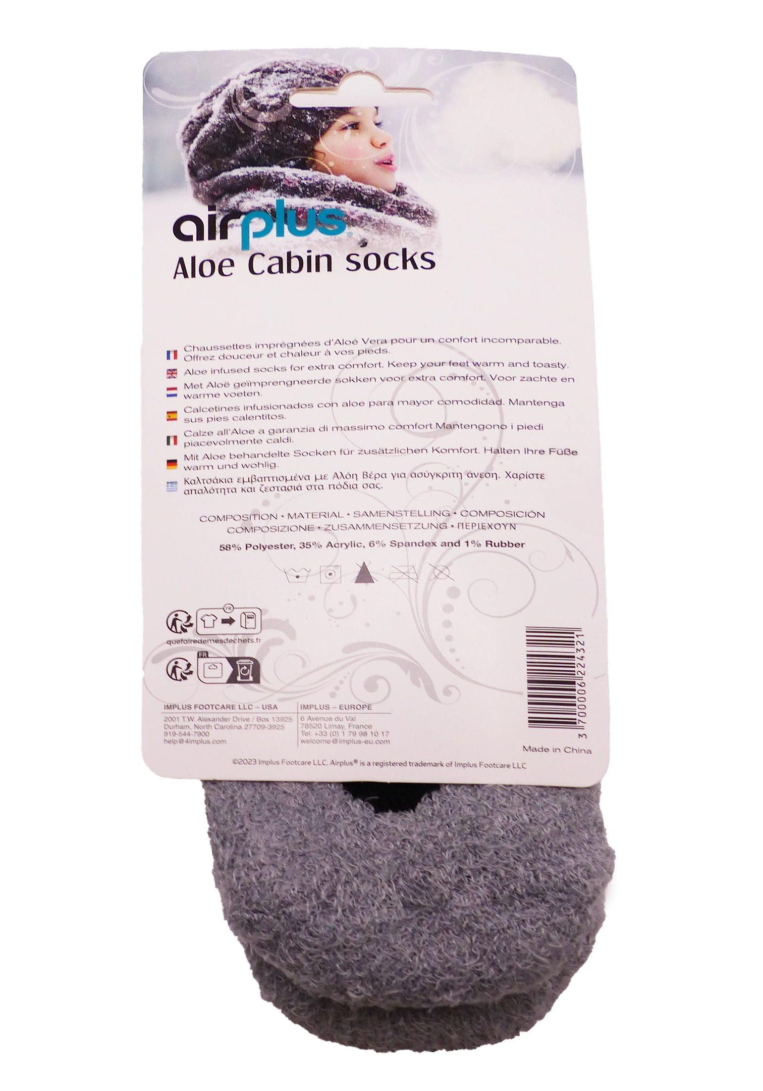 58% polyester, 35% acrylique, 6% spandex et 1% caoutchouc, assurant souplesse, résistance et confort. L’infusion d’aloe vera et de vitamine E dans la fibre permet une diffusion continue d’actifs hydratants, pour une peau plus douce et souple. Cette composition convient à toutes les peaux, y compris les plus sensibles, et garantit une utilisation régulière sans irritation.​