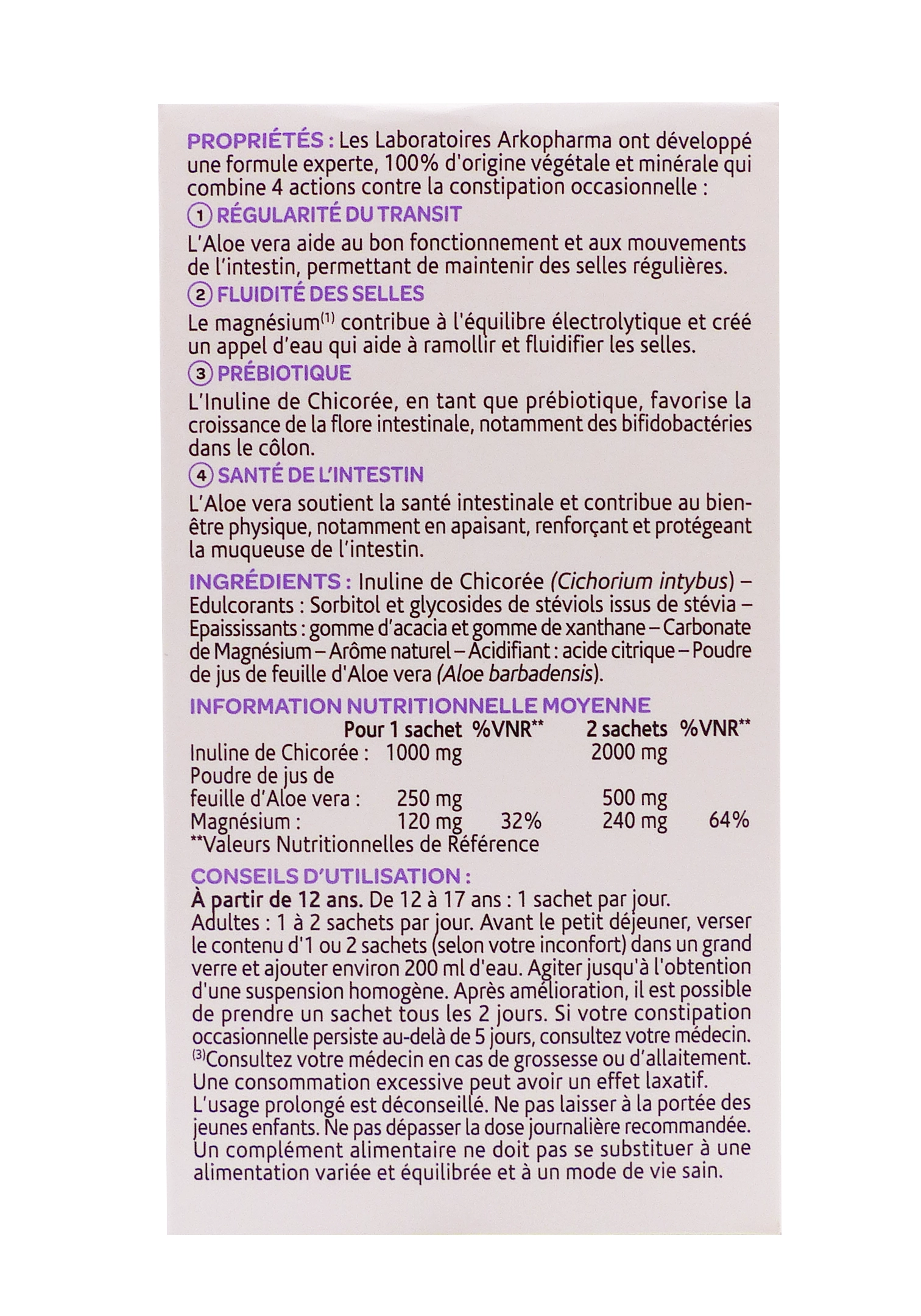 Arkogélules Constipation Occasionnelle d’Arkopharma 10 sachets sont un complément alimentaire naturel conçu pour soulager la constipation passagère chez l’adulte et l’adolescent à partir de 12 ans, en favorisant un transit intestinal régulier grâce à une formule 4-en-1 synergique. À base d’inuline de chicorée (prébiotique nourrissant la flore intestinale), de poudre de jus de feuille d’aloe vera (stimulant doux du transit), de magnésium (fluidifiant des selles) et d’ingrédients d’origine végétale, ce produit agit en profondeur sans effet laxatif brutal ni accoutumance, idéal pour les épisodes liés au stress, voyages ou changementsalimentaires.