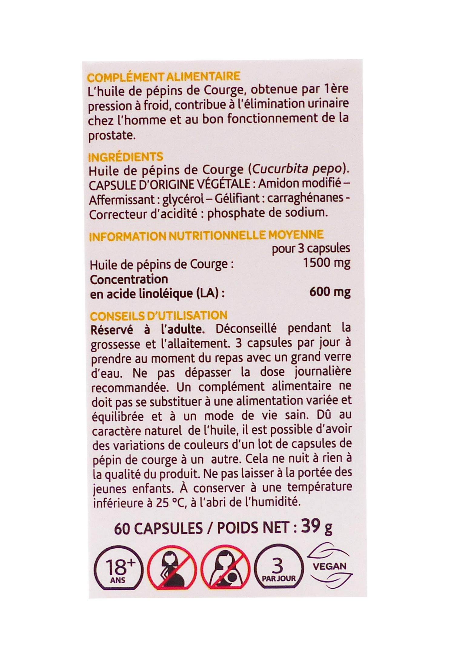 L’huile de pépins de courge est particulièrement intéressante chez l’homme à partir de 45–50 ans pour accompagner le confort urinaire (jet faible, envies fréquentes, levers nocturnes). Pour optimiser les résultats, une cure de 2 à 3 mois est généralement conseillée. A associée à une hygiène de vie adaptée : hydratation suffisante, activité physique régulière et alimentation équilibrée.