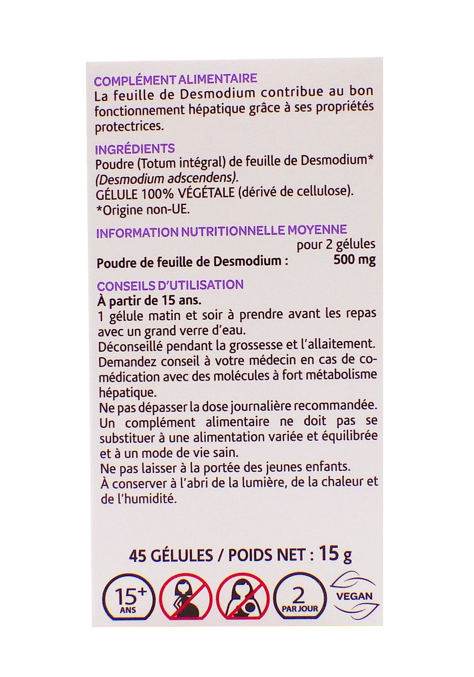 Formule 100% naturelle avec totum intégral de feuille de Desmodium (500 mg par dose), sans additifs chimiques ni colorants pour une action synergique maximale.
