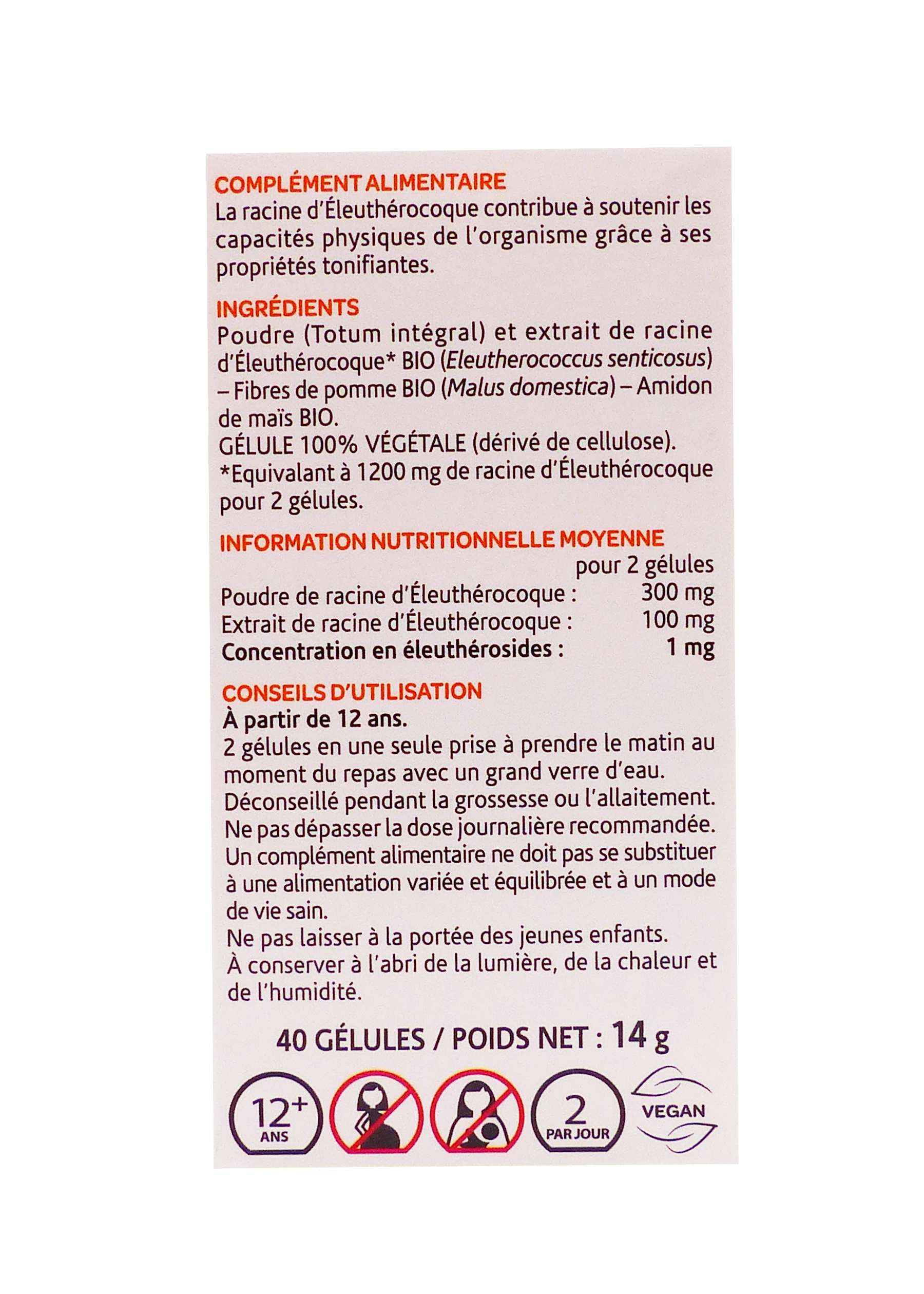 Formule Bio concentrée : Poudre + extrait standardisé en éleuthérosides pour une synergie complète des actifs, certifiée sans pesticides ni OGM.