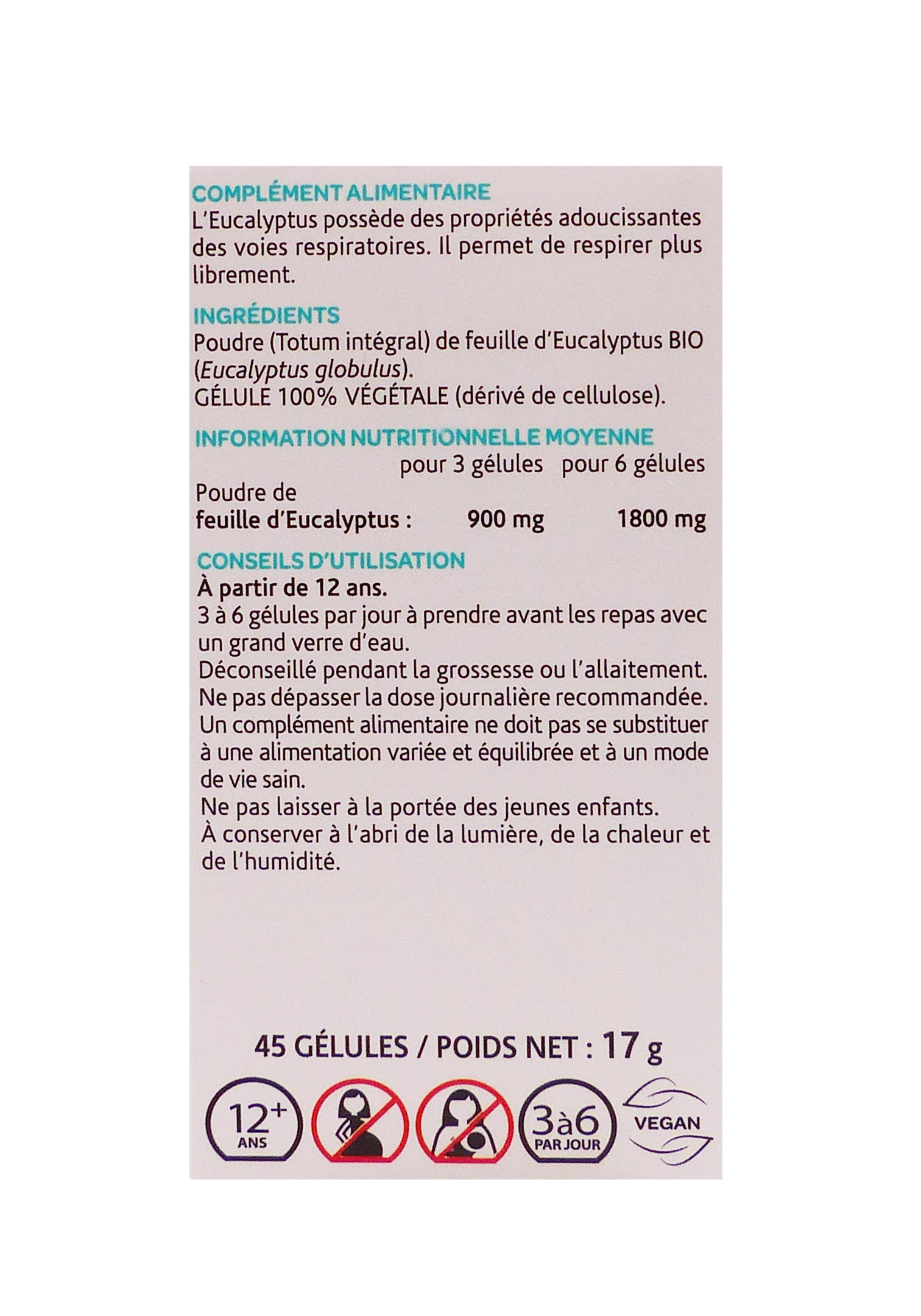 - Apaise efficacement les voies respiratoires grâce à l’eucalyptol et tanins aux effets antiseptiques, décongestionnants et fluidifiants des mucosités.