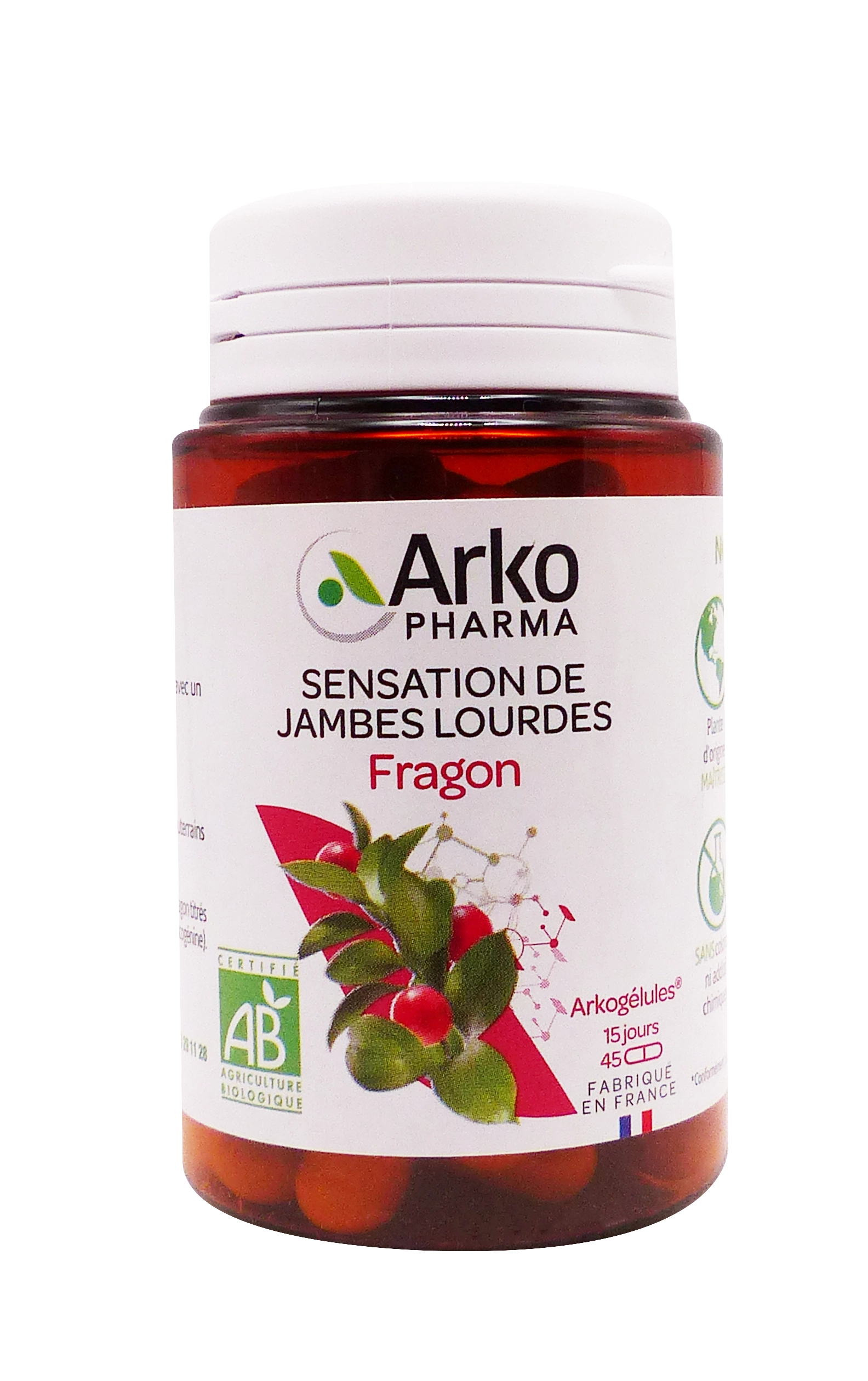 Arkopharma Arkogélules Fragon Bio 45 gélules est un complément alimentaire à base de poudre d’organes souterrains de fragon bio 🌿, aussi appelé petit-houx, obtenue par broyage pour préserver 100% des actifs naturels. Il contribue à réduire la sensation de jambes lourdes et fatiguées en favorisant le drainage veineux et en tonifiant la microcirculation sanguine.