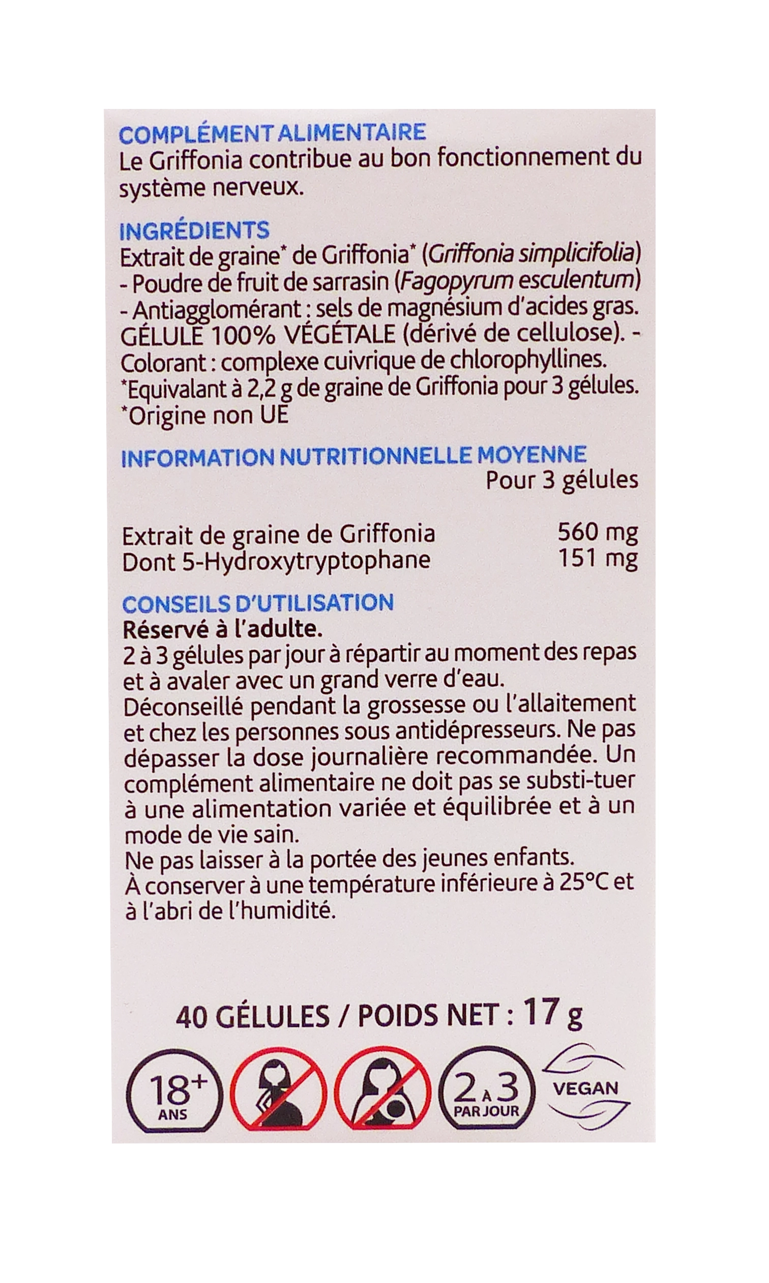 • Extrait de graine de griffonia (Griffonia simplicifolia) : 375 mg, dont 5-hydroxytryptophane (5-HTP) : 150 mg (équivalent à 3,8 g de graines).