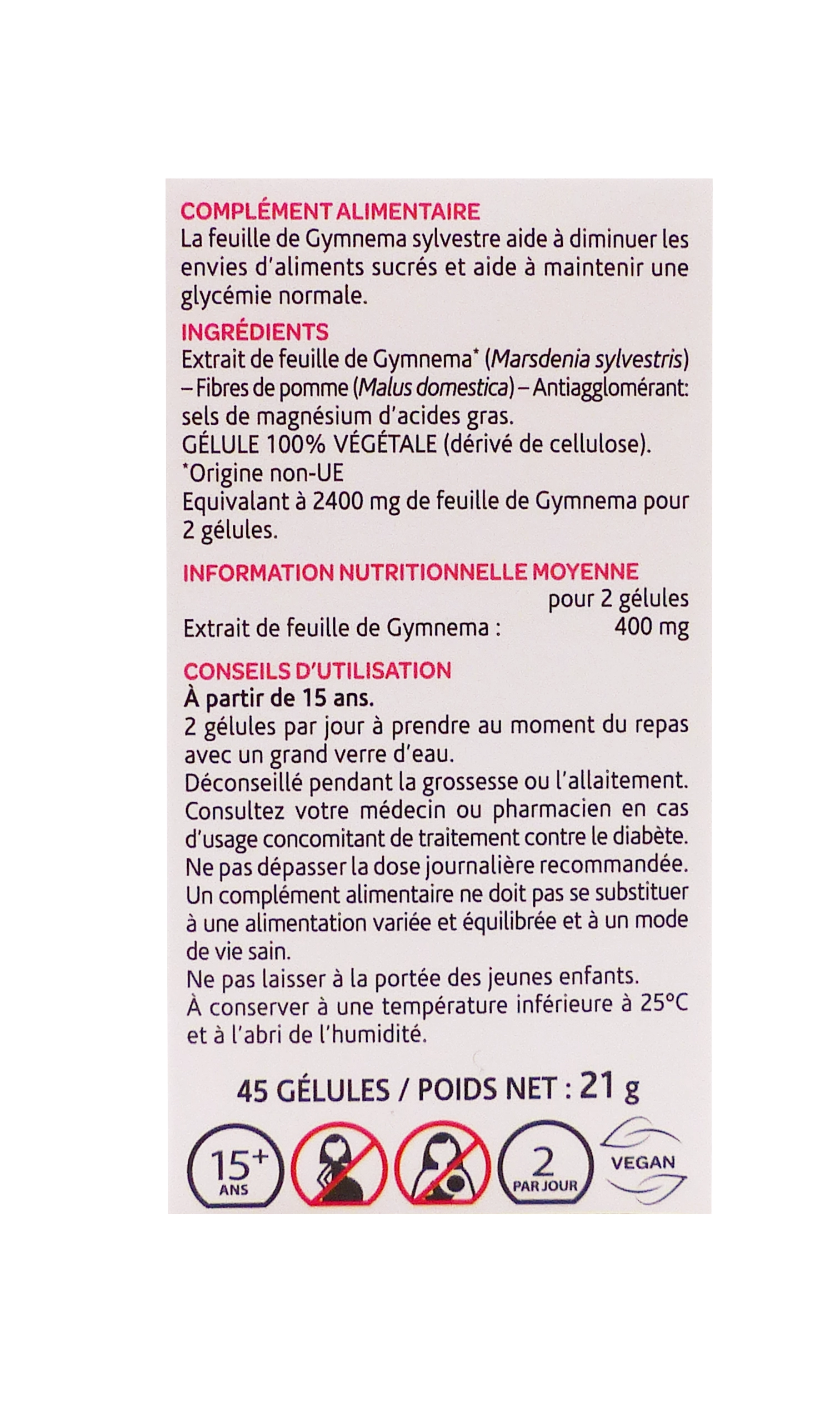 Arkogélules Gymnema Sylvestre d’Arkopharma 45 gélules sont un complément alimentaire à base d’extrait concentré de feuilles de Gymnema sylvestre, une plante tropicale reconnue pour réguler la glycémie. Grâce à l’acide gymnémique et la gurmarine, elle inhibe la perception du goût sucré, réduisant les envies compulsives de sucre tout en favorisant l’assimilation du glucose par les cellules. Formule 100% végétale adaptée aux adultes et adolescents dès 15 ans, fabriquée en France.