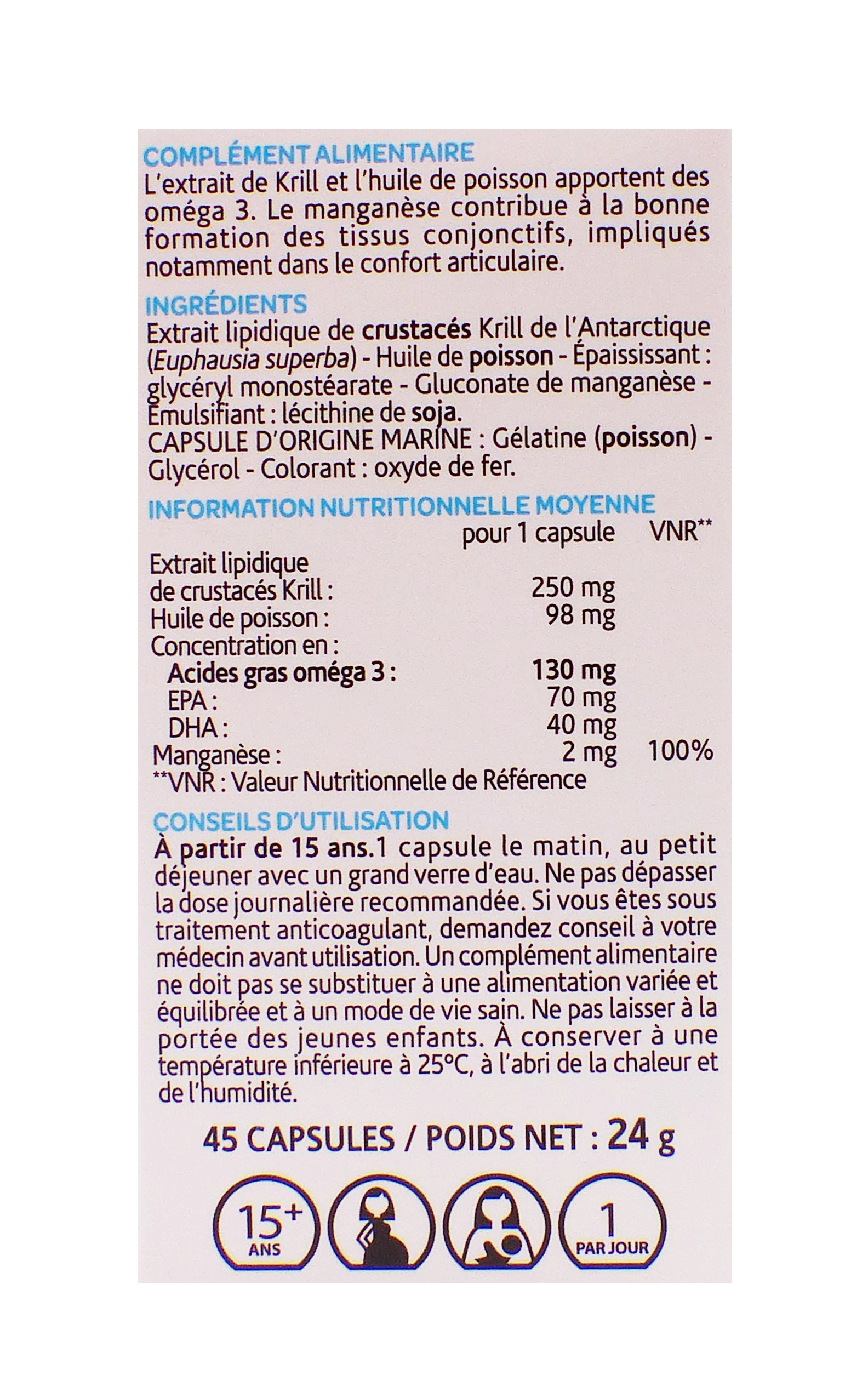 - Formule ciblée 45 gélules pour 45 jours, sans résidus chimiques, capsule marine pure.