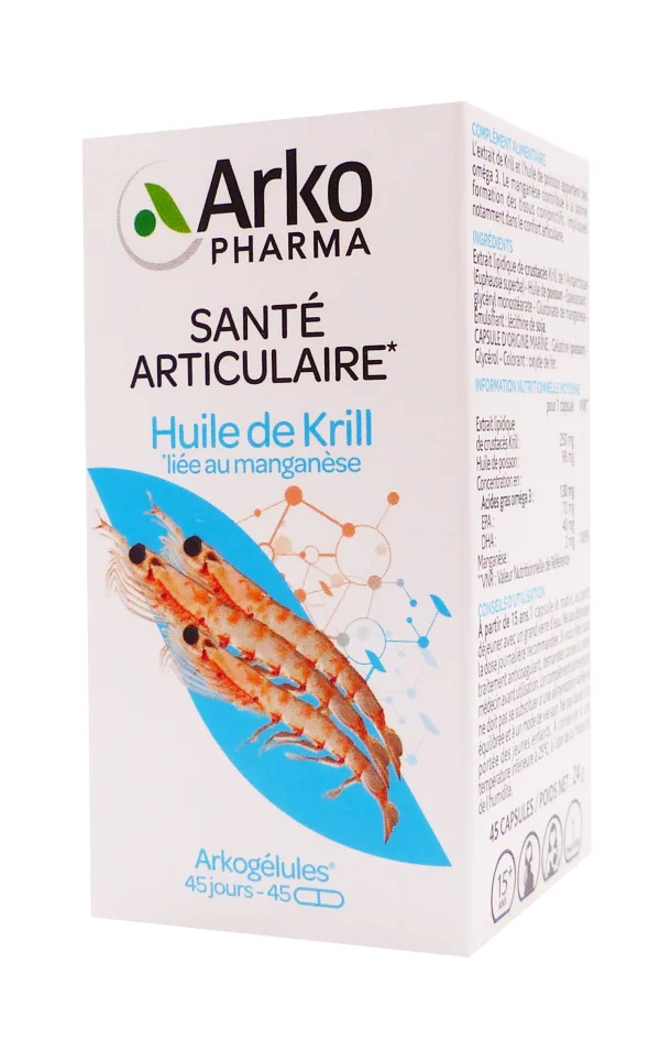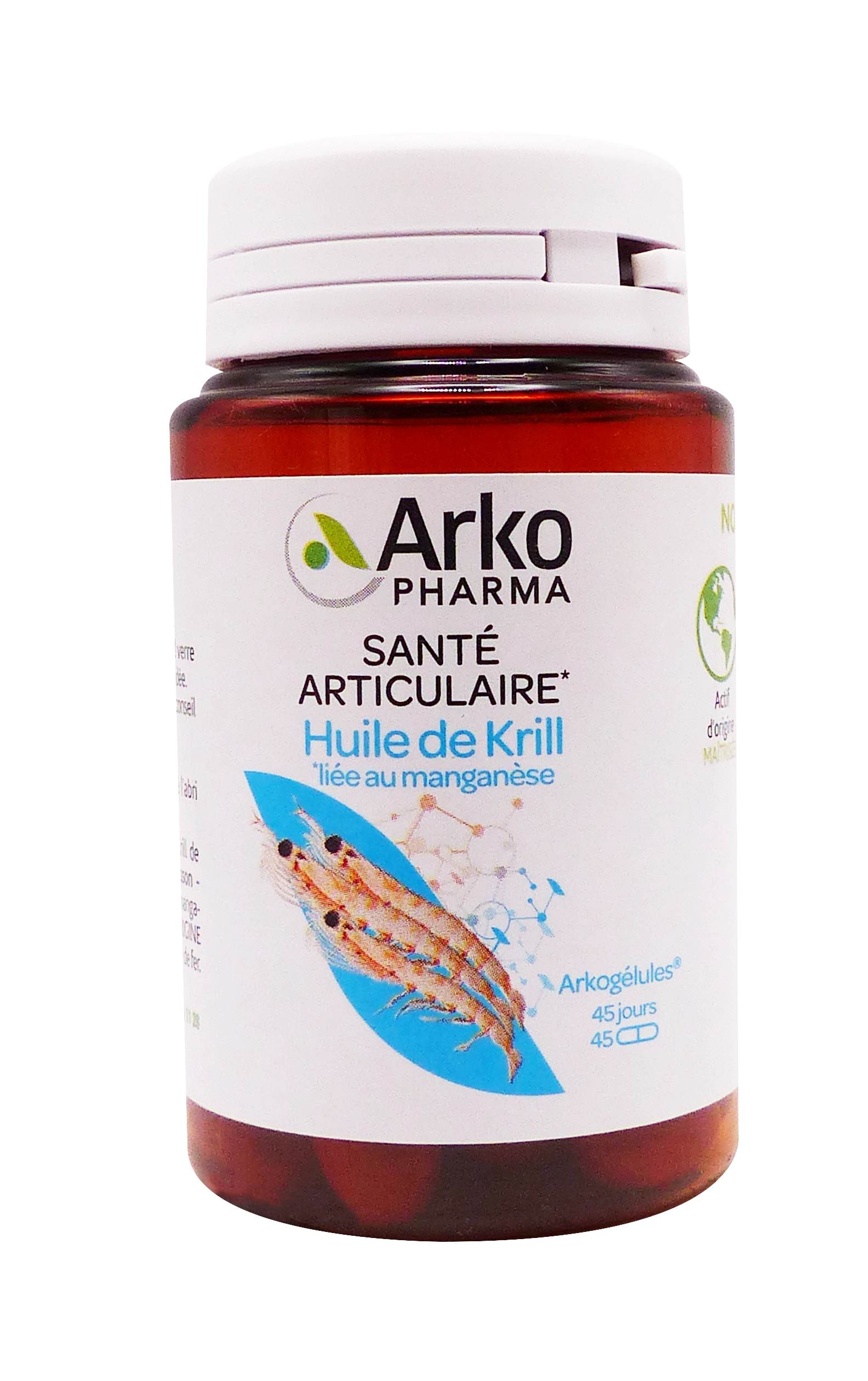Arkopharma Arkogélules Huile de Krill 45 gélules et Manganèse est un complément alimentaire associant extrait lipidique de krill, huile de poisson riche en oméga-3 et gluconate de manganèse. Il contribue à la formation normale des tissus conjonctifs (cartilage, os, tendons) et au confort articulaire, grâce à la synergie oméga-3 antioxydants-manganèse, particulièrement adapté aux articulations sensibles.