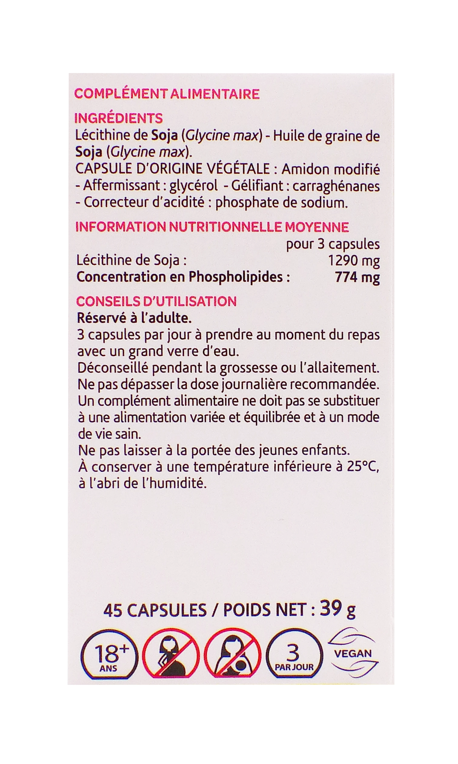 Consultez un médecin en cas d’allergie au soja, grossesse, allaitement ou traitement hypocholestérolémiant, car des interactions sont possibles.