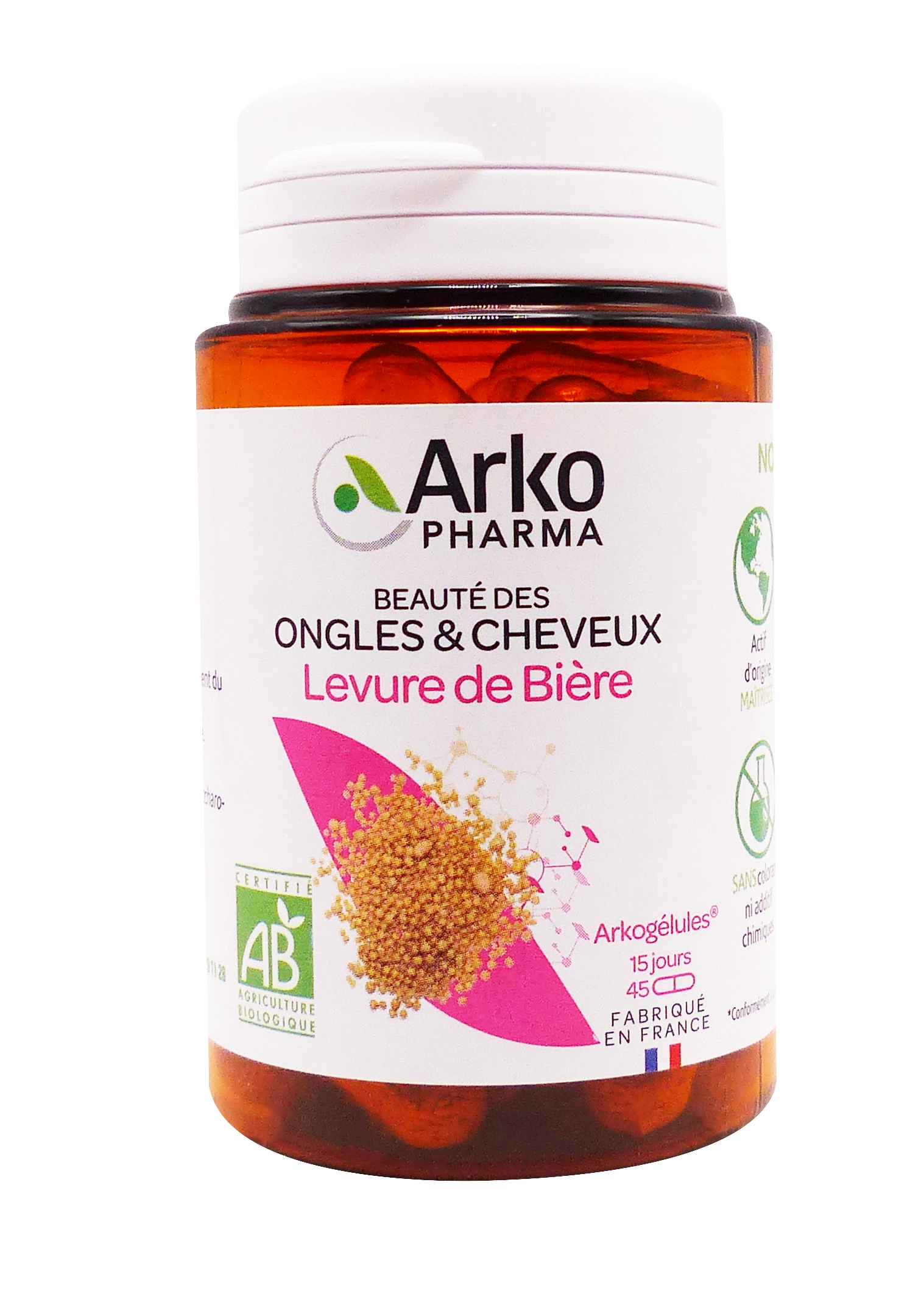 Les Arkogélules levure de bière Arkopharma constituent un complément alimentaire formulé à base de levure de bière riche en protéines, en acides aminés, en vitamines B ainsi qu’en fer, potassium et phosphore, recommandé pour la bonne santé des ongles et des cheveux.