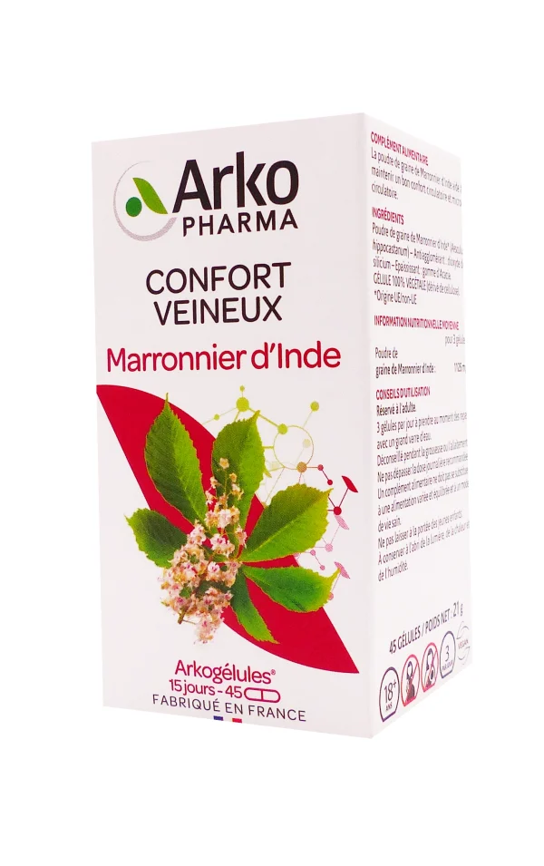 Arkopharma Arkogélules Marronnier d’Inde Bio 45 gélules est un complément alimentaire à base de poudre de graines de marronnier d’Inde bio, obtenue par broyage pour préserver 100% des actifs naturels. Il contribue à maintenir un bon confort circulatoire et à conserver des jambes légères en améliorant le tonus veineux et la résistance des petits vaisseaux sanguins.
