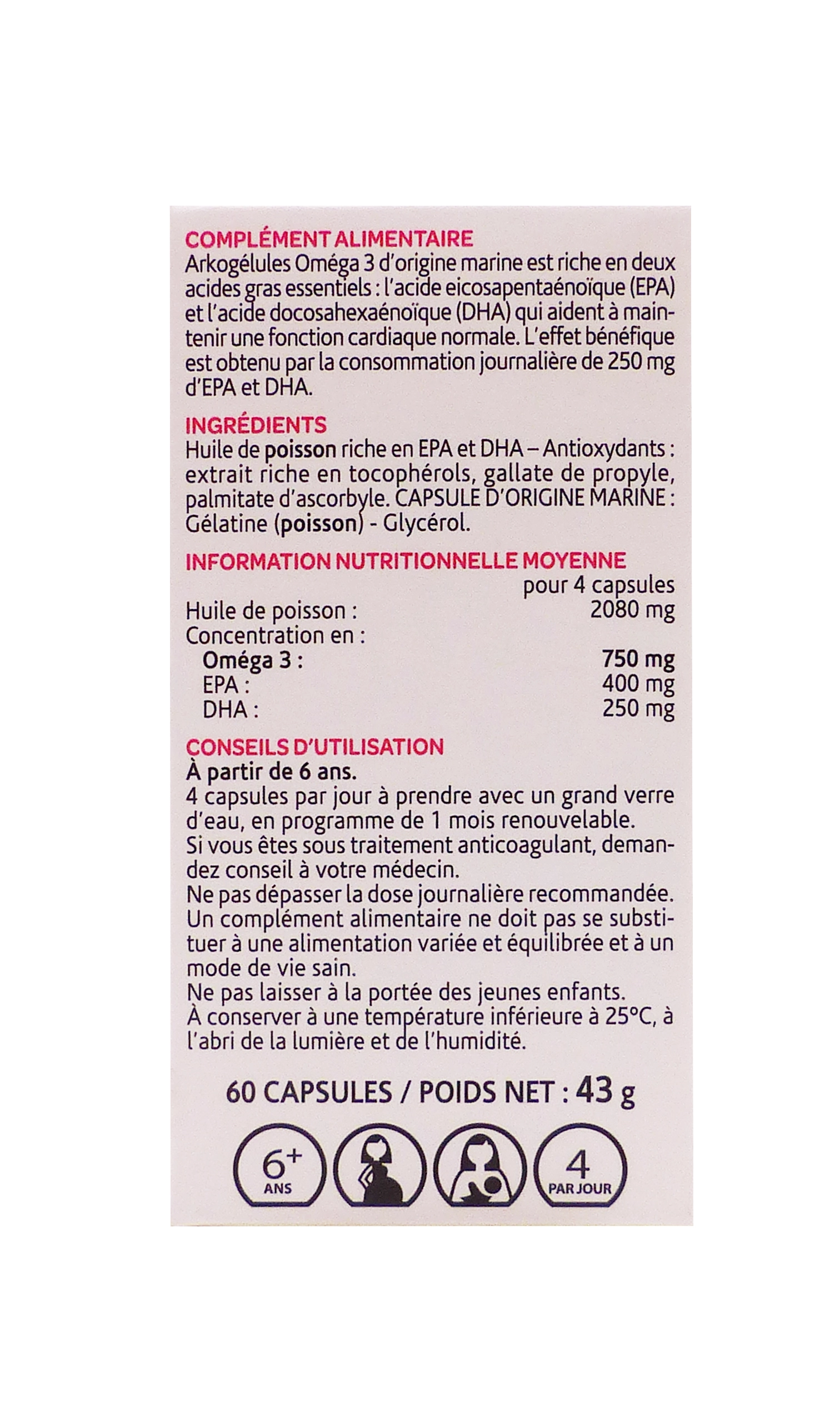 Arkogélules Oméga 3 est Idéal en prévention chez les personnes à risque cardio-vasculaire ; associez à une alimentation riche en poissons gras 2 fois par semaine.