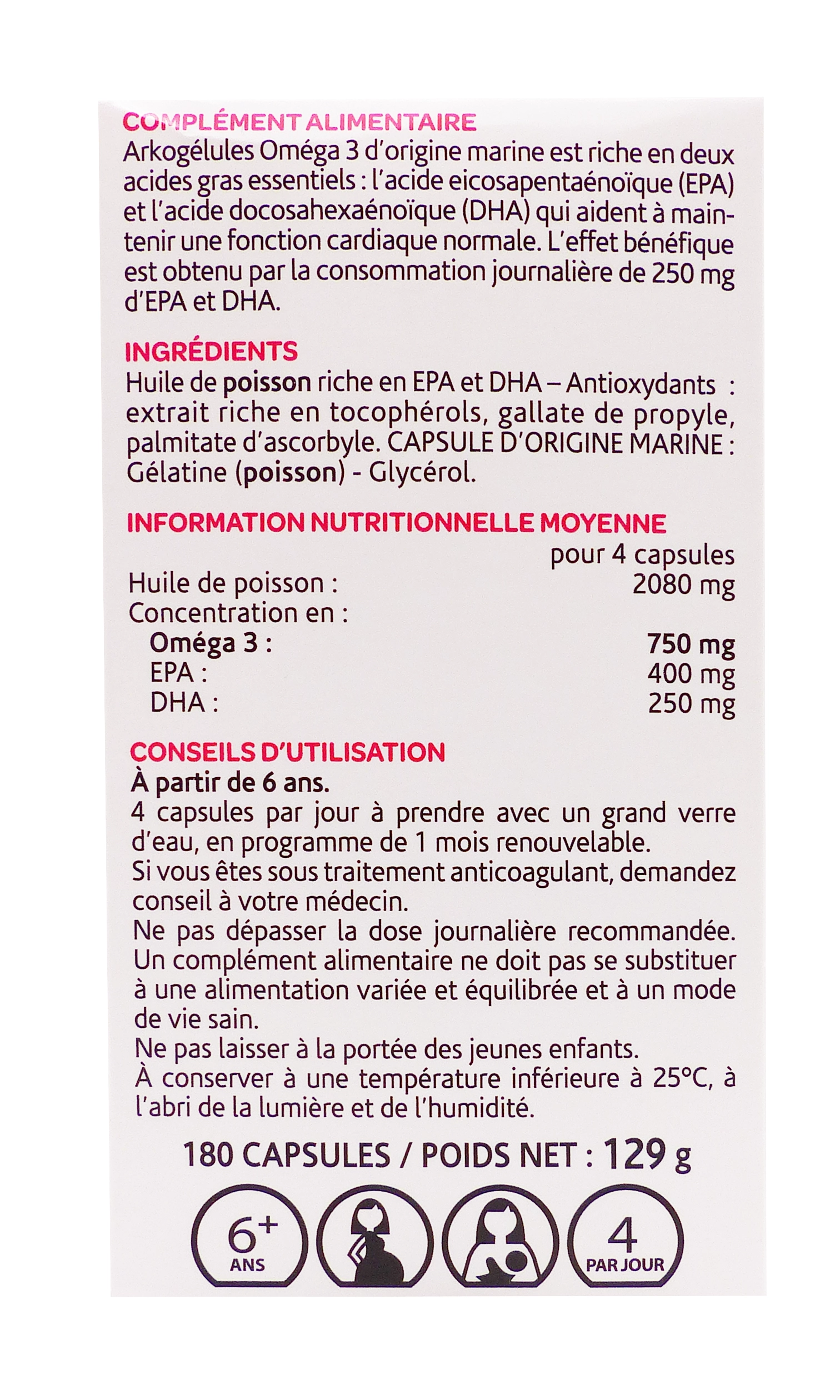 Arkopharma Arkogélules Oméga 3, 180 capsules est un complément alimentaire présenté en 180 capsules d’origine marine, riche en acides gras essentiels EPA et DHA extraits d’huile de poisson, formulé pour aider à maintenir une fonction cardiaque normale grâce à une consommation journalière minimale de 250 mg de ces oméga-3.