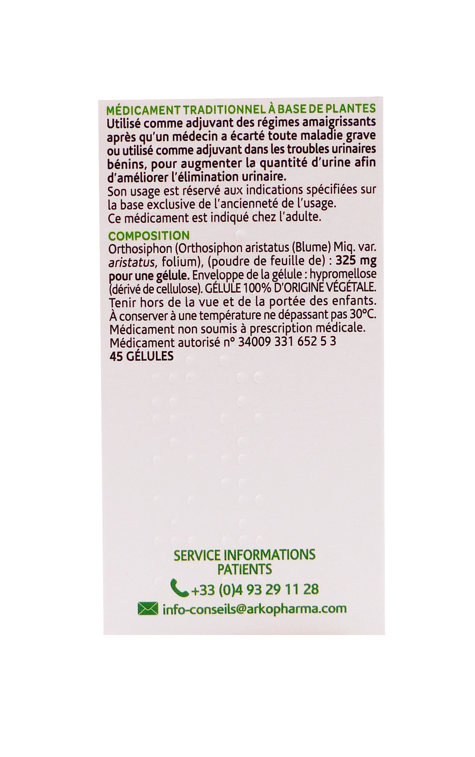 Arkopharma Arkogélules Orthosiphon 45 gélules est un médicament traditionnel à base de poudre de feuilles d’orthosiphon, utilisé traditionnellement comme adjuvant des régimes amaigrissants après avis médical excluant toute pathologie grave, et pour favoriser la diurèse dans les troubles urinaires bénins. Ses propriétés drainantes et dépuratives facilitent les fonctions d’élimination rénale et digestive, avec des effets reconnus sur le métabolisme de l’acide urique, hypoglycémiant et antioxydant