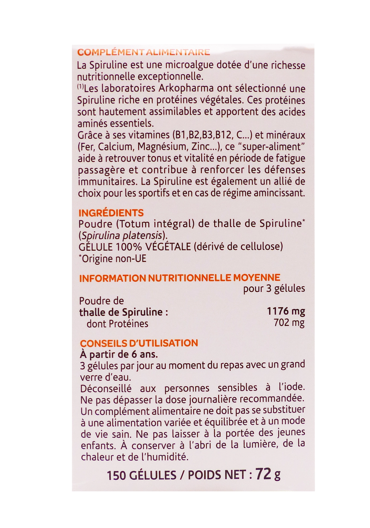 Arkogélules Spiruline Bio 150 gélules Arkopharma est un complément alimentaire à base de spiruline bio, une micro-algue riche en protéines, fer, vitamines B12, phycocyanine et antioxydants, traditionnellement utilisée pour favoriser le tonus et la vitalité en cas de fatigue passagère, soutenir l’immunité et contribuer à réduire la fatigue.
