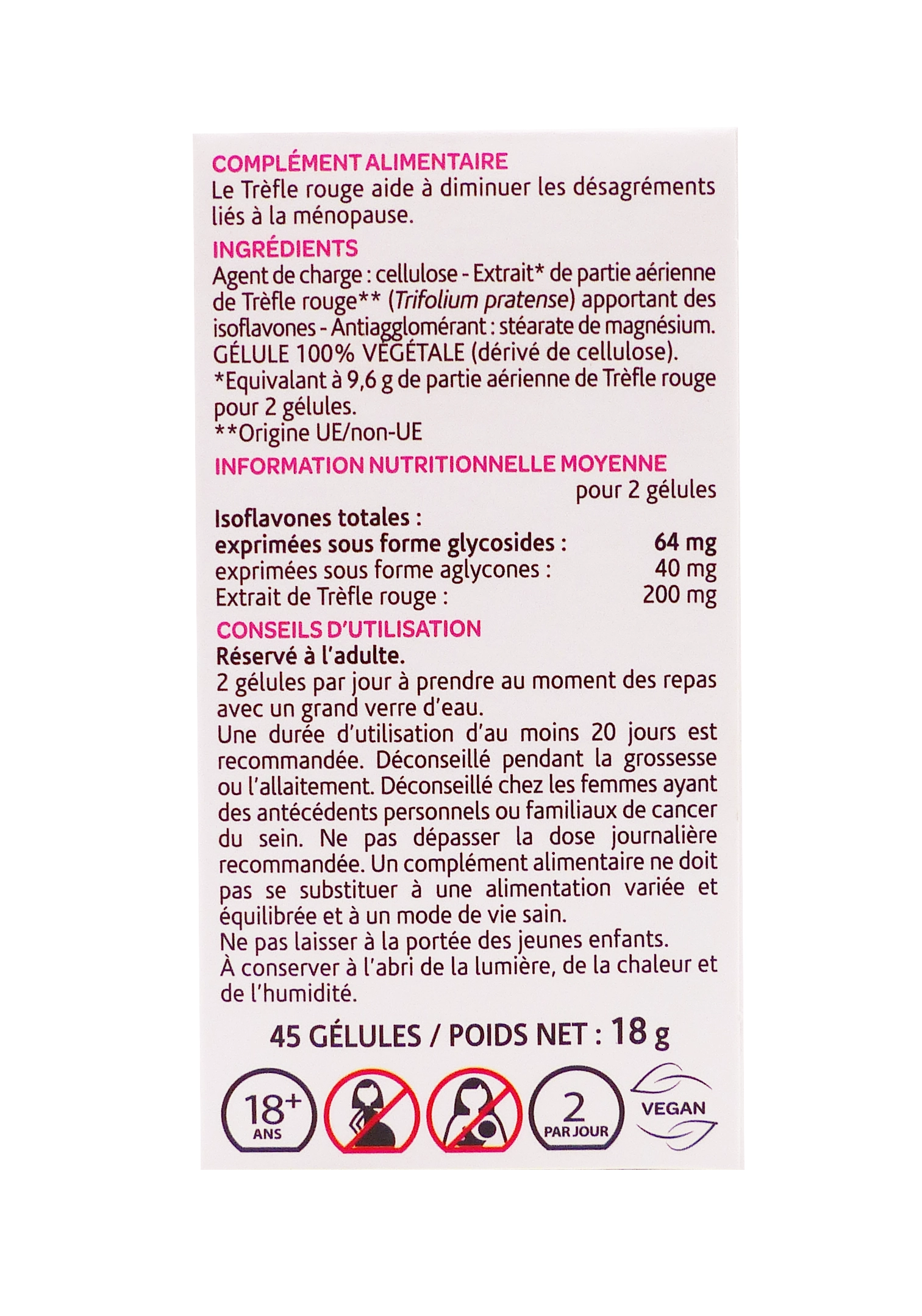 Titrage garanti : 64 mg d’isoflavones glycosides (40 mg aglycones) pour 2 gélules, équivalent à 9,6 g de plante fraîche.
