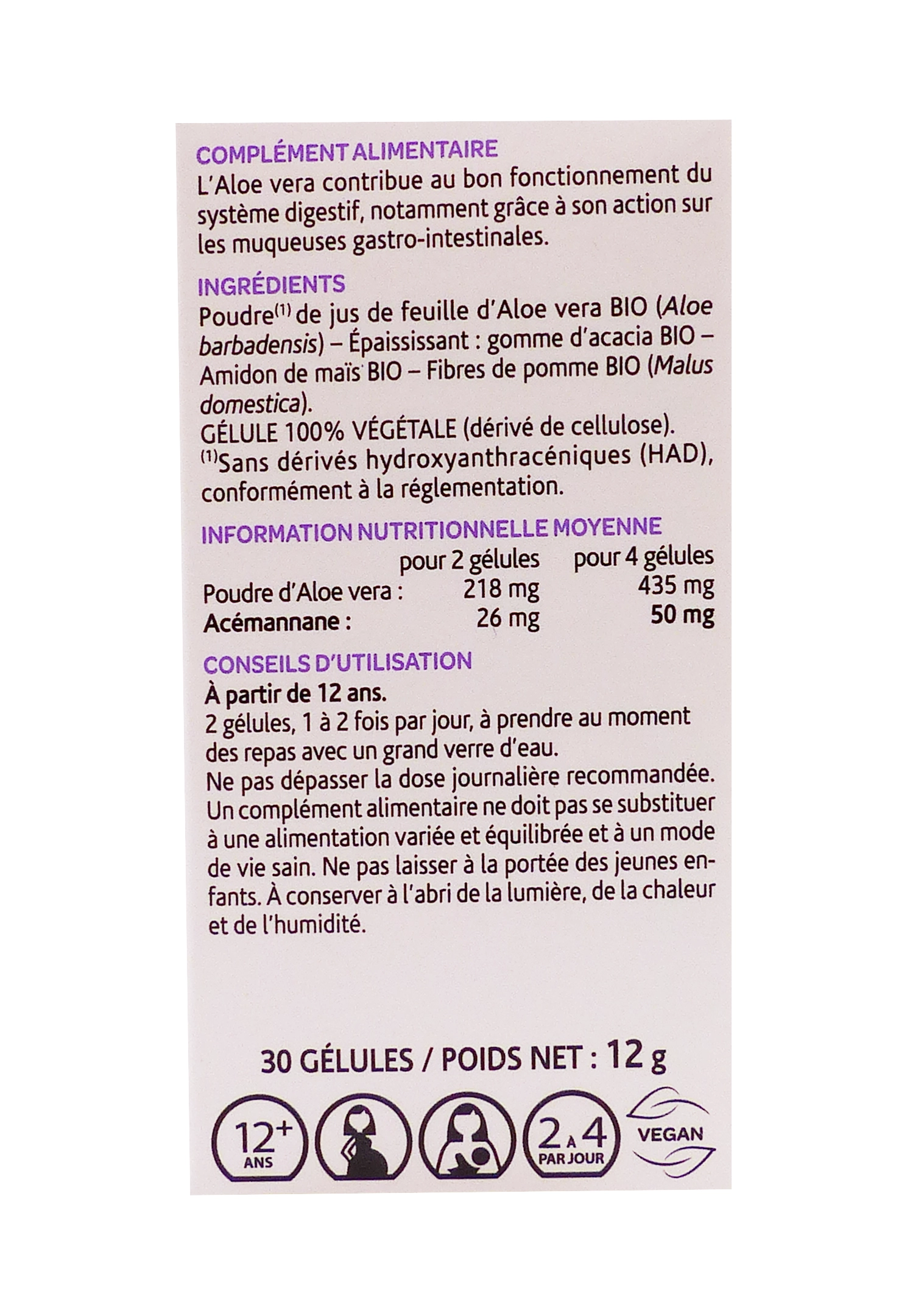 - Formule bio hautement concentrée (équivalent 435 mg de poudre d’aloe vera pour 4 gélules), titrée en acémannane pour une action ciblée sur les muqueuses digestives.