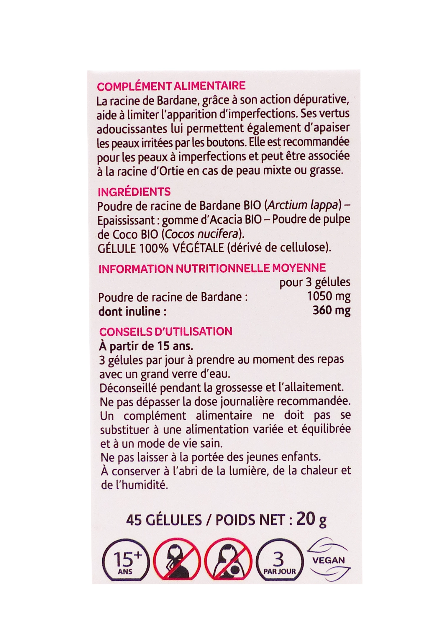 • Formule concentrée : 350 mg racine de bardane par gélule (1050 mg/jour standard), poudre totum intégral.