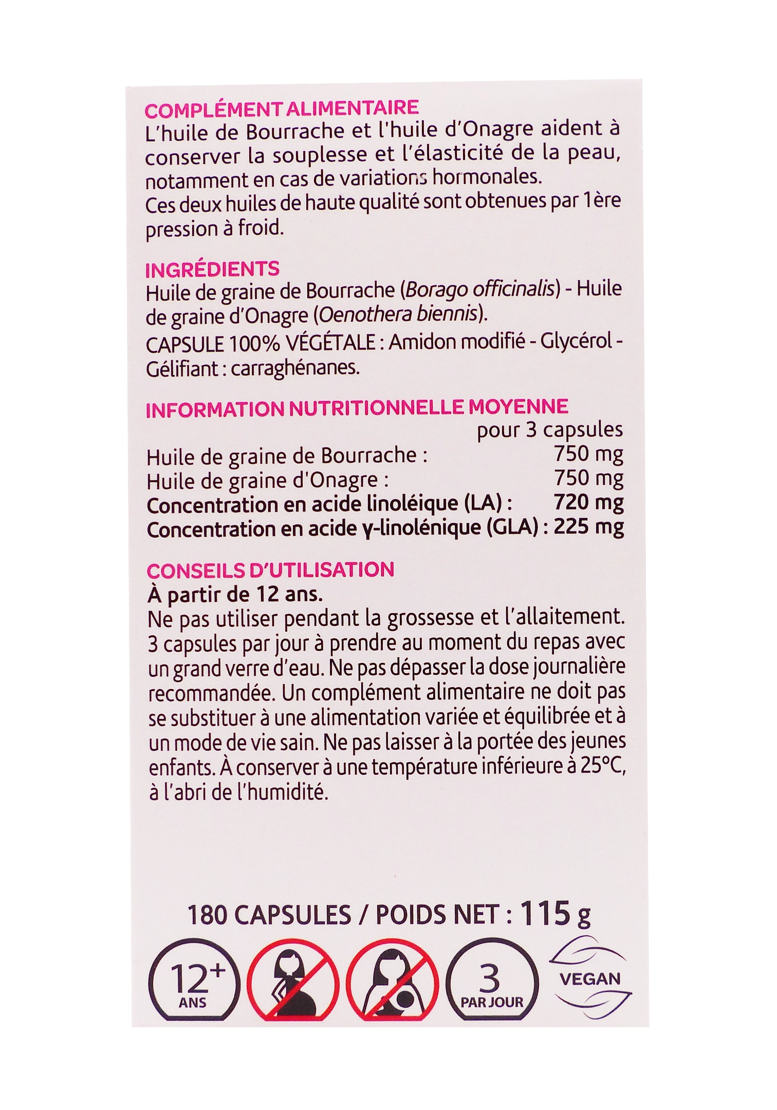 • Synergie unique de bourrache et onagre pour un apport optimal en GLA (225 mg) et LA (720 mg) par dose journalière, favorisant l’hydratation et la souplesse cutanée.