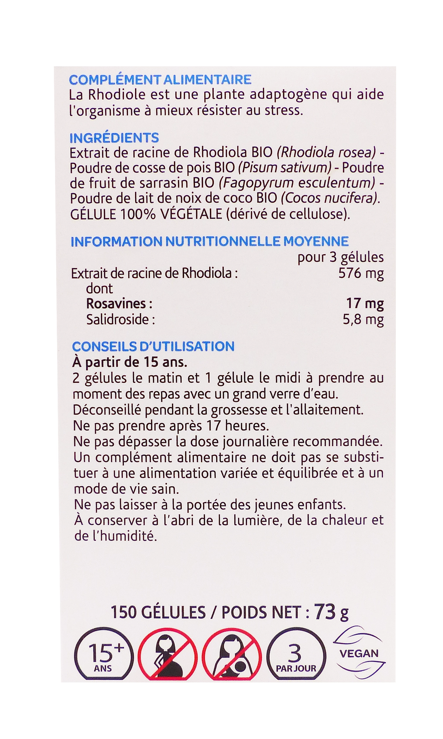 Ce complément naturel met en avant un extrait standardisé de rhodiole bio par dose journalière, ces composés aux effets adaptogènes qui soutiennent la résistance au stress sans causer de somnolence. Conçu par Arkopharma pour adolescents dès 15 ans et adultes, il est certifié bio, végan🌿 et fabriqué en France, avec un format 150 gélules pour une cure de 50 jours.