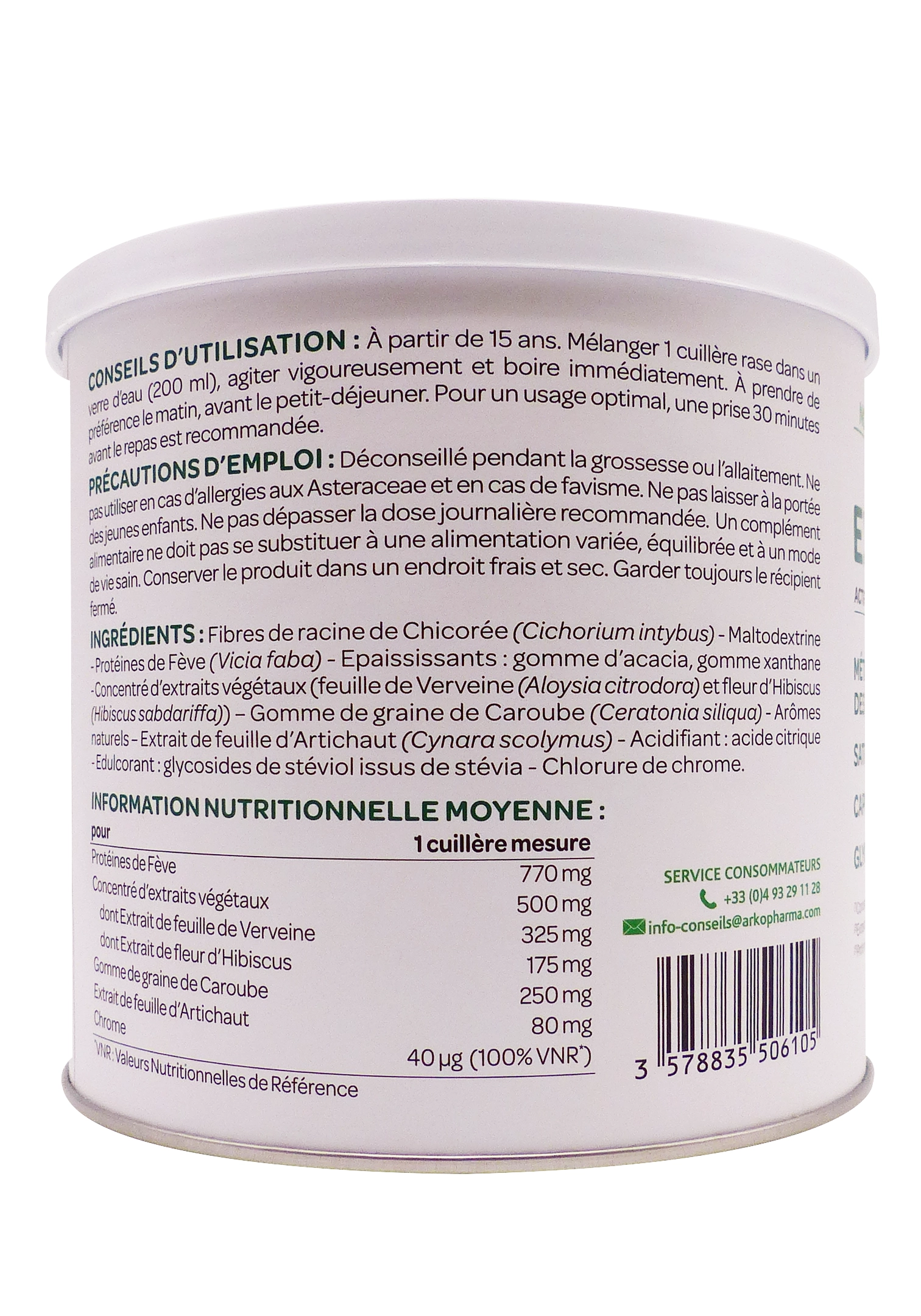 Expert Minceur GLP-1 d’Arkopharma est une poudre 100% d’origine naturelle 🌿 à base de plantes, fibres et protéines végétales, sans sucres ajoutés ni additifs chimiques. Le format pot de 270 g délivre 30 doses (1 cuillère-mesure par jour), à mélanger avec 200 ml d’eau pour un shake onctueux prêt en 30 secondes. Son actif phare, un concentré breveté de verveine citronnée et d’hibiscus, est cliniquement testé pour stimuler la production endogène de GLP-1, hormone clé de la satiété et du contrôle métabolique. Fabriqué en France, végan et sans gluten, il cible une action multifonction pour une minceur respectueuse du corps.