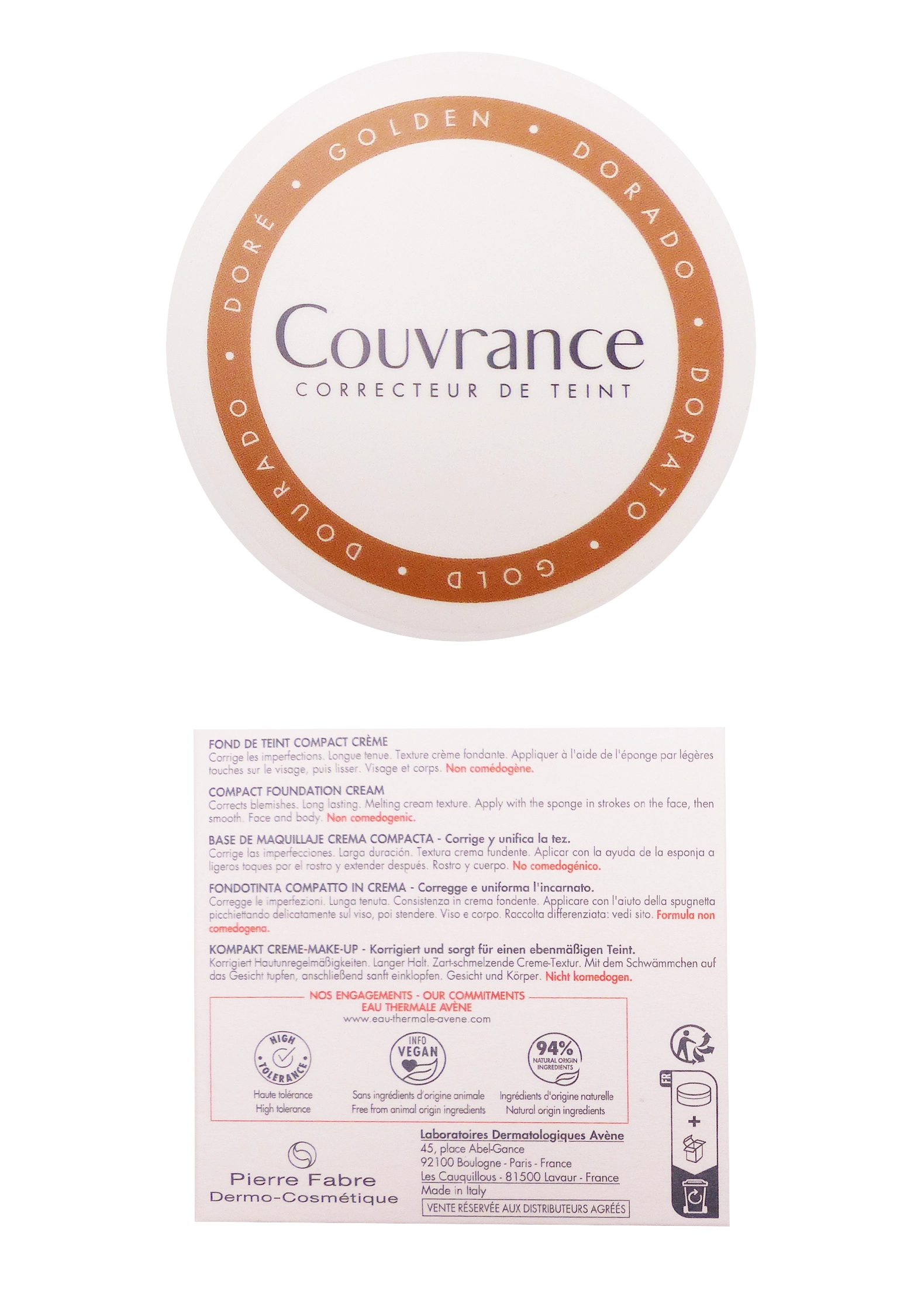 La teinte1.4 doré est idéale pour les peaux claires à mates, avec un sous-ton chaud, et apporte un éclat naturel sans effet orangé ni démarcation. Sa texture crème ultra-douce et fondante assure une application homogène, un fini mat velouté et une tenue exceptionnelle jusqu’à12 heures. Ce fond de teint compact crème Couvrance camoufle efficacement les rougeurs, taches, cicatrices, rosacée, vitiligo, psoriasis et angiomes, pour un teint unifié et lumineux.