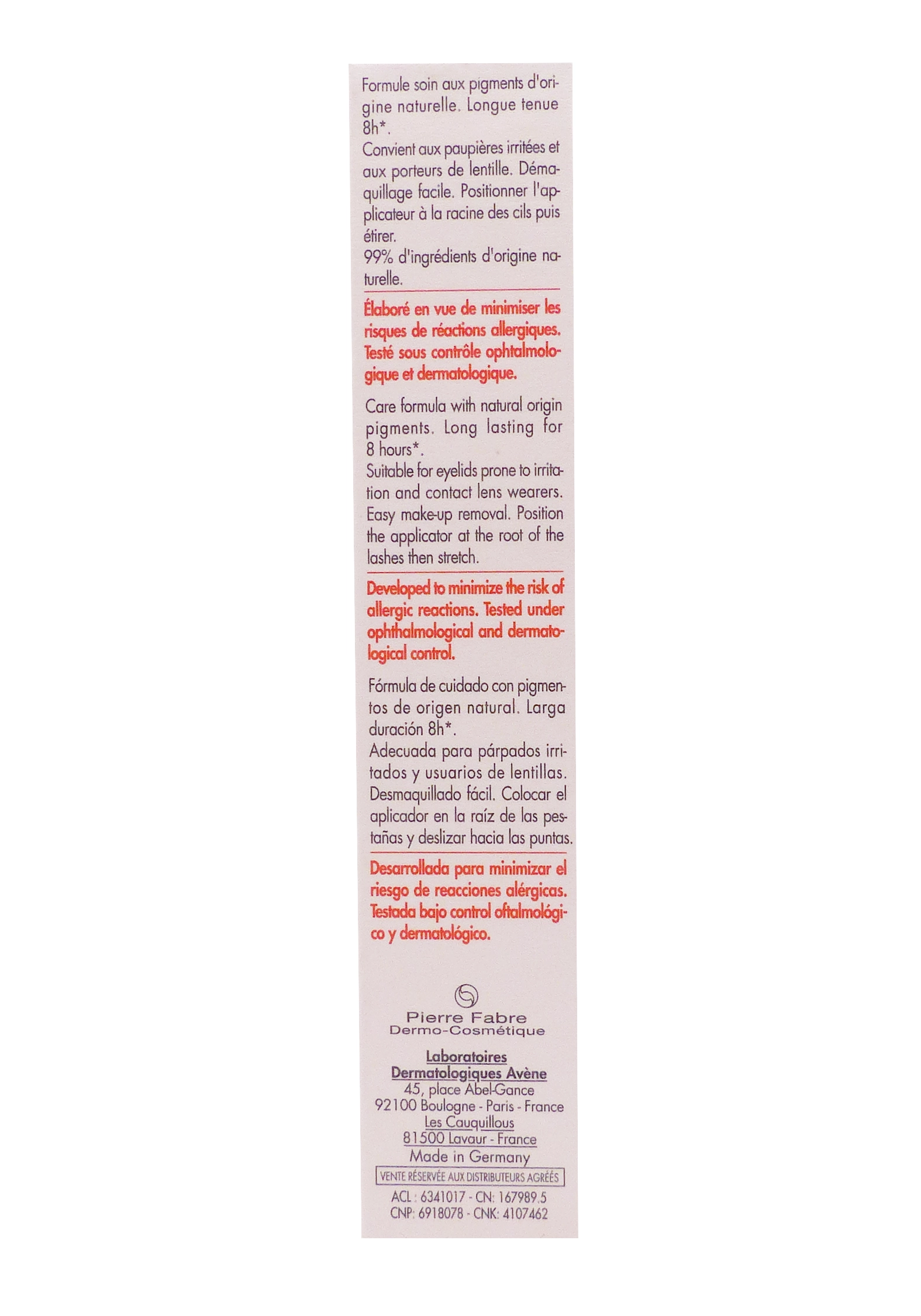 La composition d’Avène Couvrance Mascara Haute Tolérance Noir7 ml repose sur une sélection rigoureuse d’ingrédients dermatologiques :