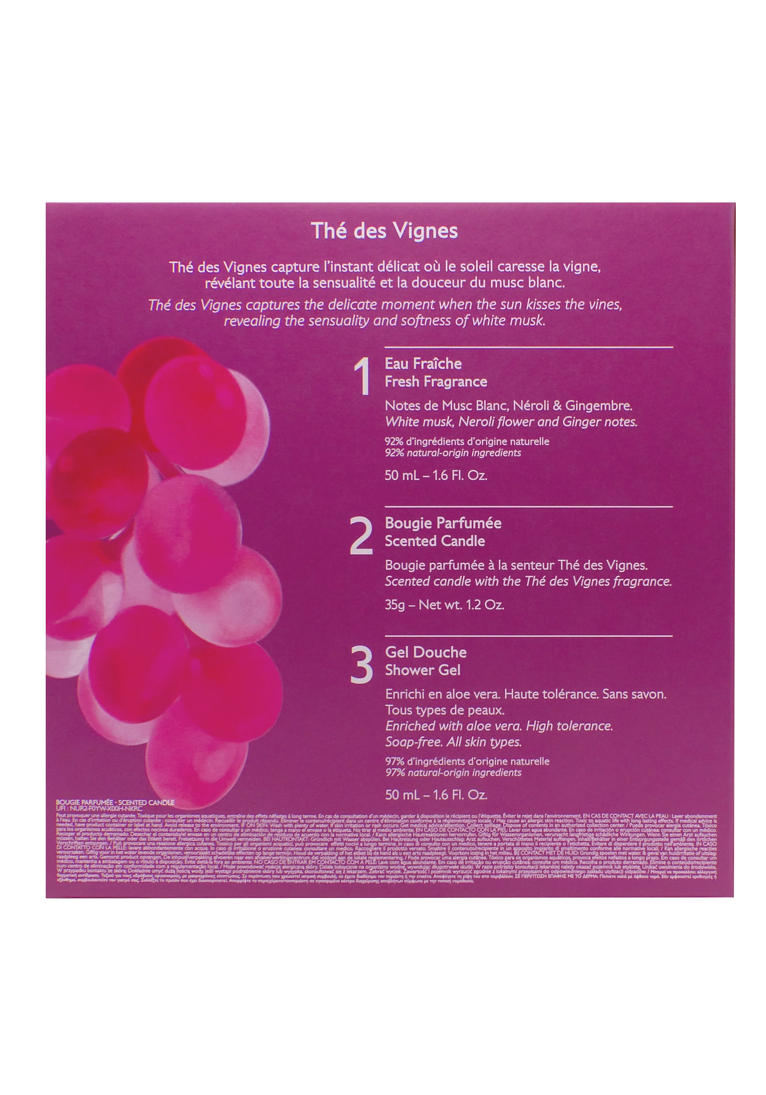 L’eau fraîche Thé des Vignes séduit par son sillage délicat et enveloppant, aux notes de musc blanc, de néroli (fleur d’oranger) et de gingembre relevées par des accords subtils de jasmin et fleur d’oranger. Cette composition parfumée, développée avec 92% d’ingrédients d’origine naturelle, crée une atmosphère lumineuse, fraîche et légèrement épicée, parfaite pour la saison hivernale et les fêtes.