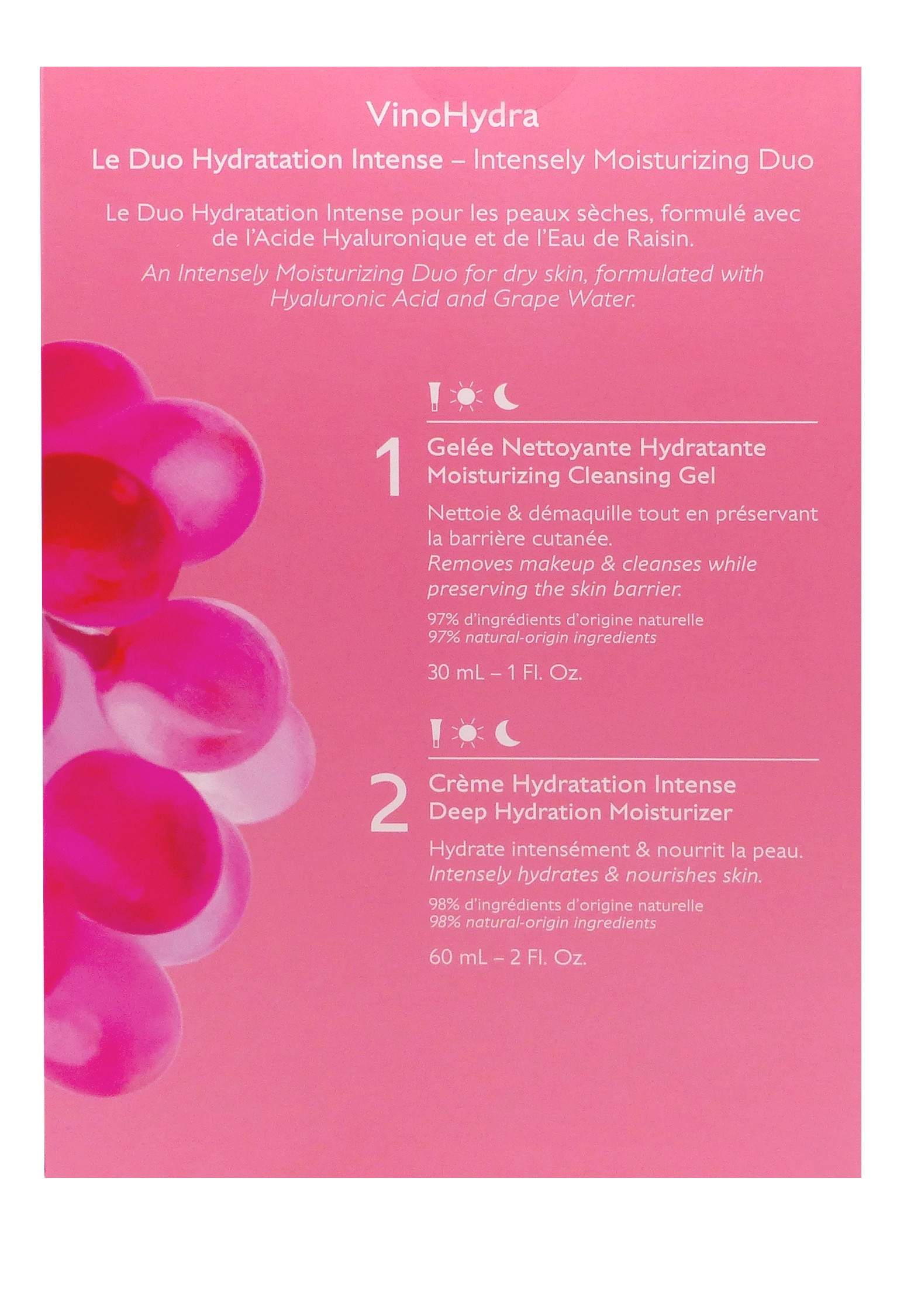 La gelée nettoyante Vinohydra complète ce rituel : elle retire impuretés, maquillage et excès de sébum, tout en restaurant l’équilibre naturel cutané grâce à sa base lavante sans savon et sans sulfates. Enrichie en eau de raisin bio, panthénol et acide hyaluronique, elle apaise et renforce la barrière cutanée sans tirailler.