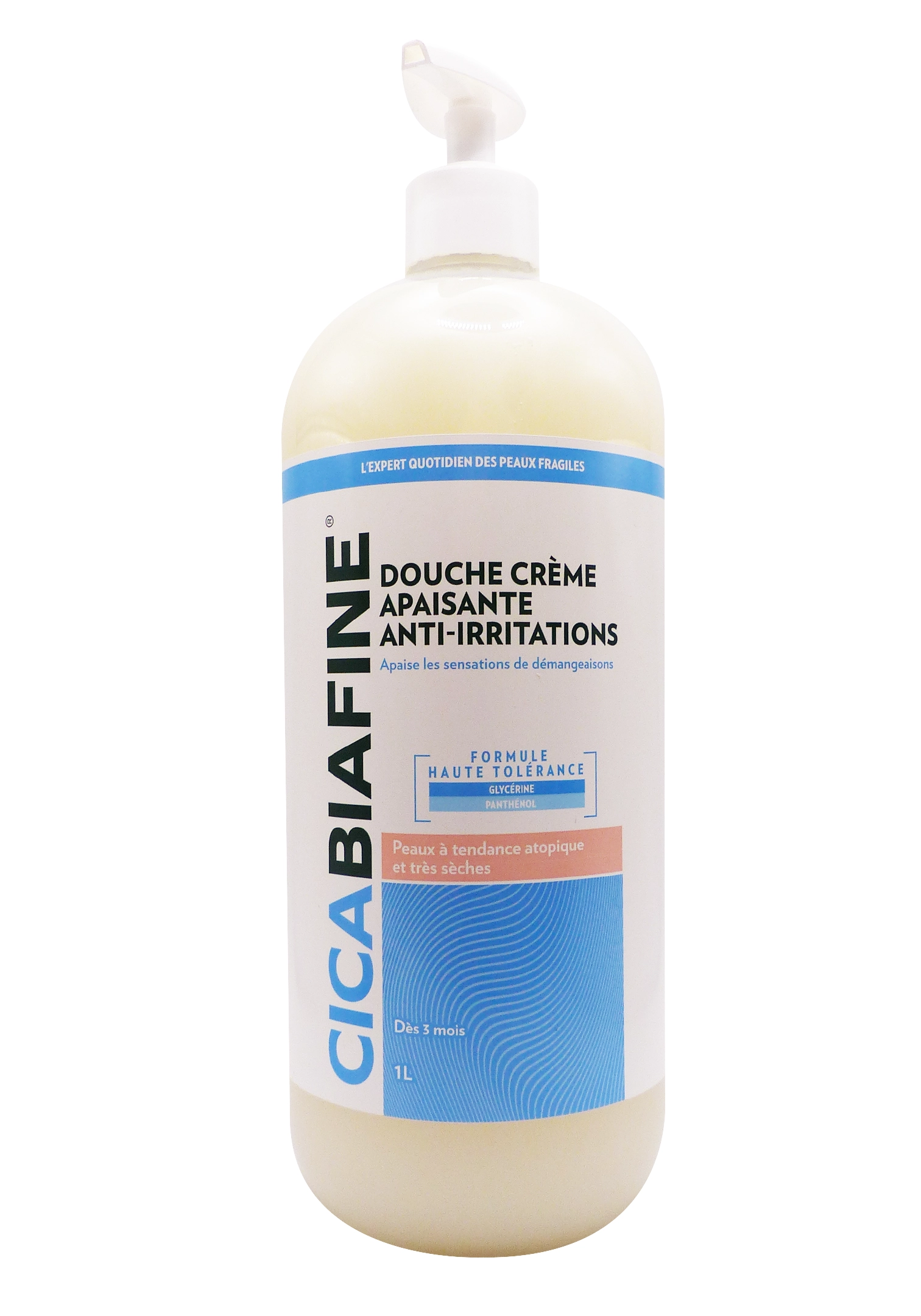 La crème douche apaisante anti-irritations Cicabiafine 1 L est un soin lavant spécialement formulé pour les peaux sèches, sensibles et sujettes aux irritations. Sa texture onctueuse nettoie la peau en douceur tout en respectant son film hydrolipidique. Enrichie en agents apaisants et hydratants, elle aide à réduire les sensations de tiraillement et d’inconfort dès la douche. Adaptée à toute la famille, elle convient à un usage quotidien pour le corps.