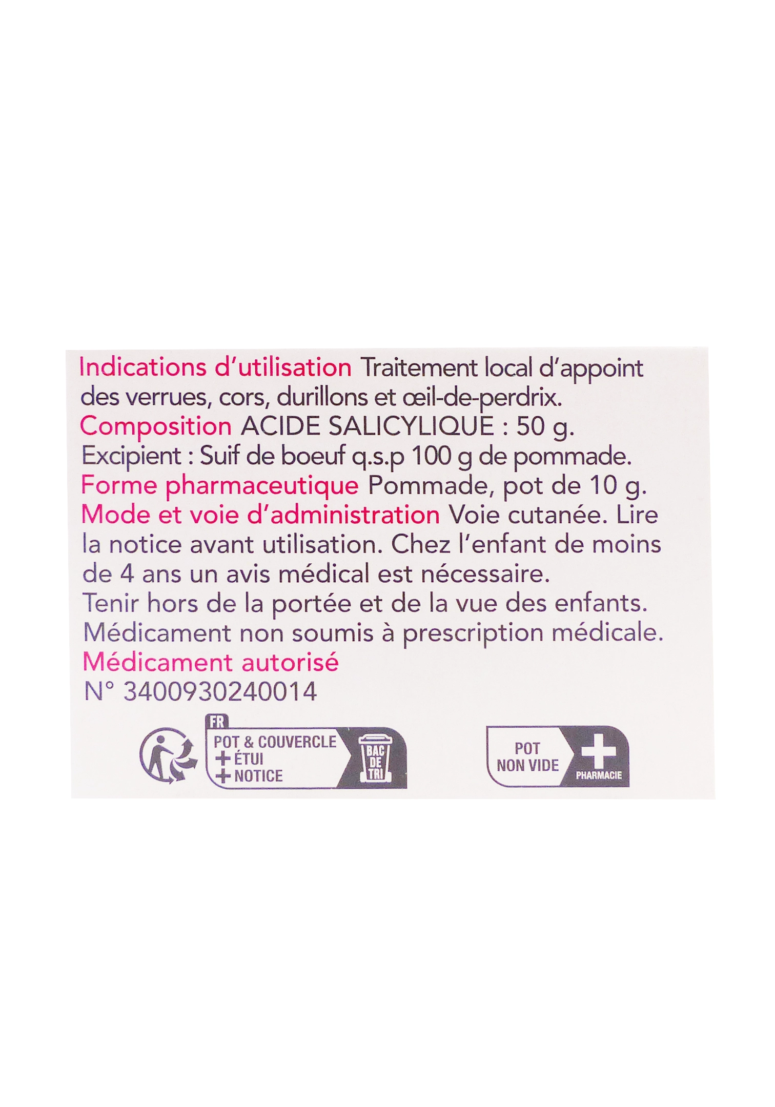 La Pommade Cochon Verrues et Cors aux Pieds 10g est un traitement kératolytique traditionnel destiné à éliminer efficacement les verrues et les cors. Grâce à sa formule concentrée en actifs exfoliants, elle agit en ramollissant et en dissolvant progressivement les couches épaissies de la peau. Elle permet ainsi de traiter localement les lésions cutanées tout en facilitant leur disparition progressive. Facile à utiliser, elle est particulièrement adaptée aux zones plantaires épaisses.