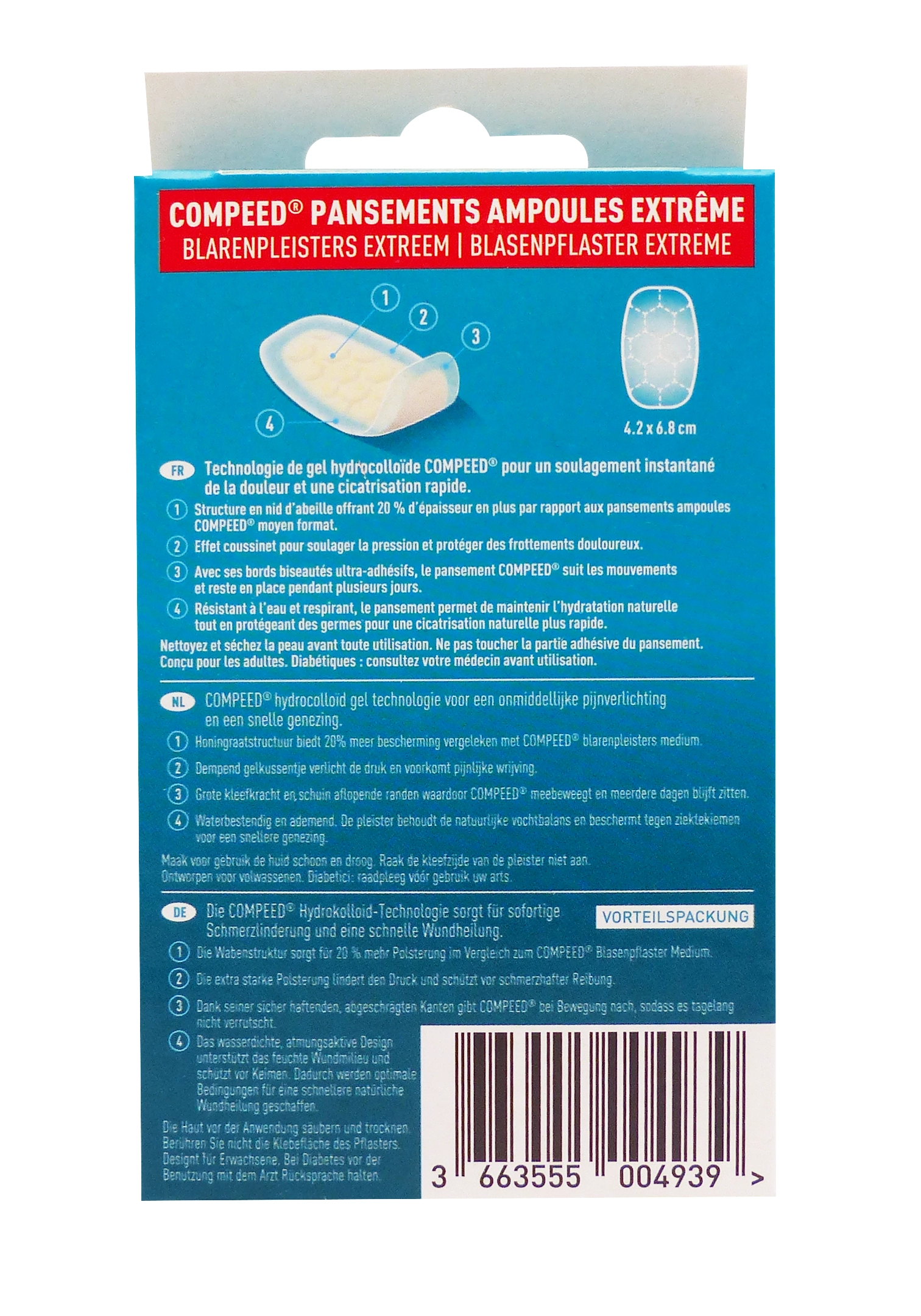 Compeed pansements ampoules Extreme Format Medium offrent à la fois une barrière physique protectrice et un environnement thérapeutique pour la peau. Ils constituent une solution à la fois curative et préventive, adaptée à tous les types de peaux, même sensibles.
