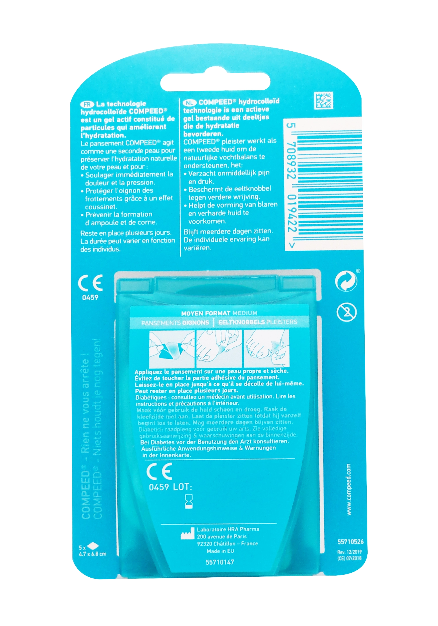 Ce format moyen est idéal pour couvrir l’ensemble de la zone de l’oignon, quel que soit le type de chaussure porté. Fine et flexible, sa structure s’adapte à la forme du pied pour un port quasi invisible. Chaque boîte contient 5 pansements Compeed, emballés individuellement pour plus d’hygiène et de praticité.