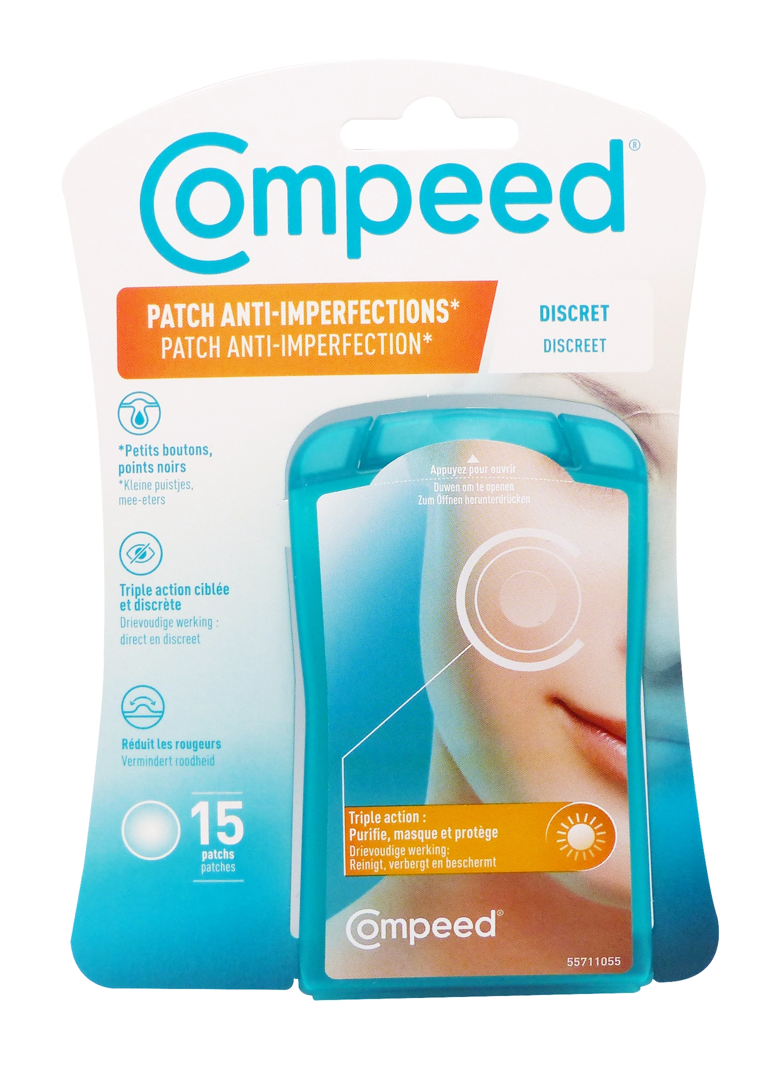Compeed 15 patchs anti-imperfections jour sont des patchs hydrocolloïdes discrets de petite taille (1,5×1,5 cm environ), conçus pour cibler individuellement petits boutons et points noirs avec une triple action purifiante, masquante et protectrice. Ils absorbent l’excès de sébum, éliminent les impuretés et réduisent les rougeurs grâce à leur technologie hydrocolloïde, tout en permettant un maquillage par-dessus pour une discrétion maximale en journée. Testés dermatologiquement pour tous types de peaux, ils agissent comme une seconde peau ultra-fine et transparente.