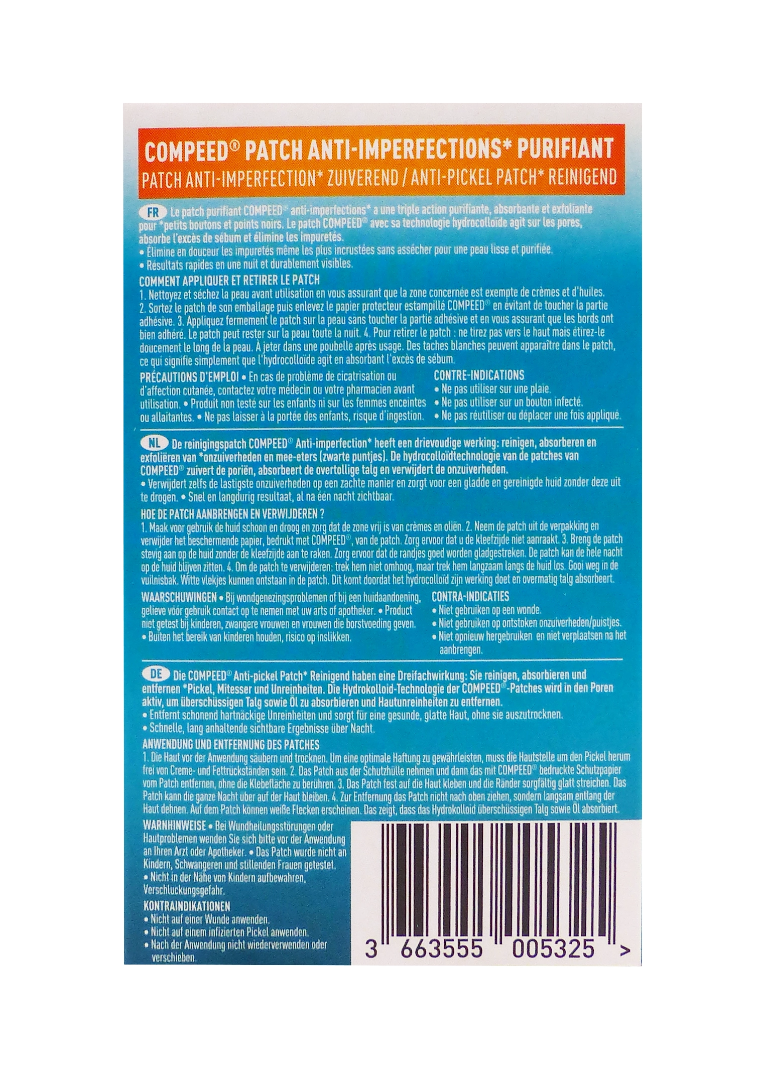 Compeed Patch Anti-Imperfections 7 patchs 4,2 cm x 6,8 cm sont des patchs hydrocolloïdes purifiants conçus pour traiter les zones étendues de petits boutons et points noirs grâce à une triple action : purification, absorption du sébum et exfoliation douce. Ils forment une barrière protectrice qui crée un microclimat optimal, éliminant les impuretés incrustées sans assécher la peau, pour un teint plus lisse et purifié au réveil. Transparents et discrets, ils sont testés dermatologiquement pour tous types de peaux.