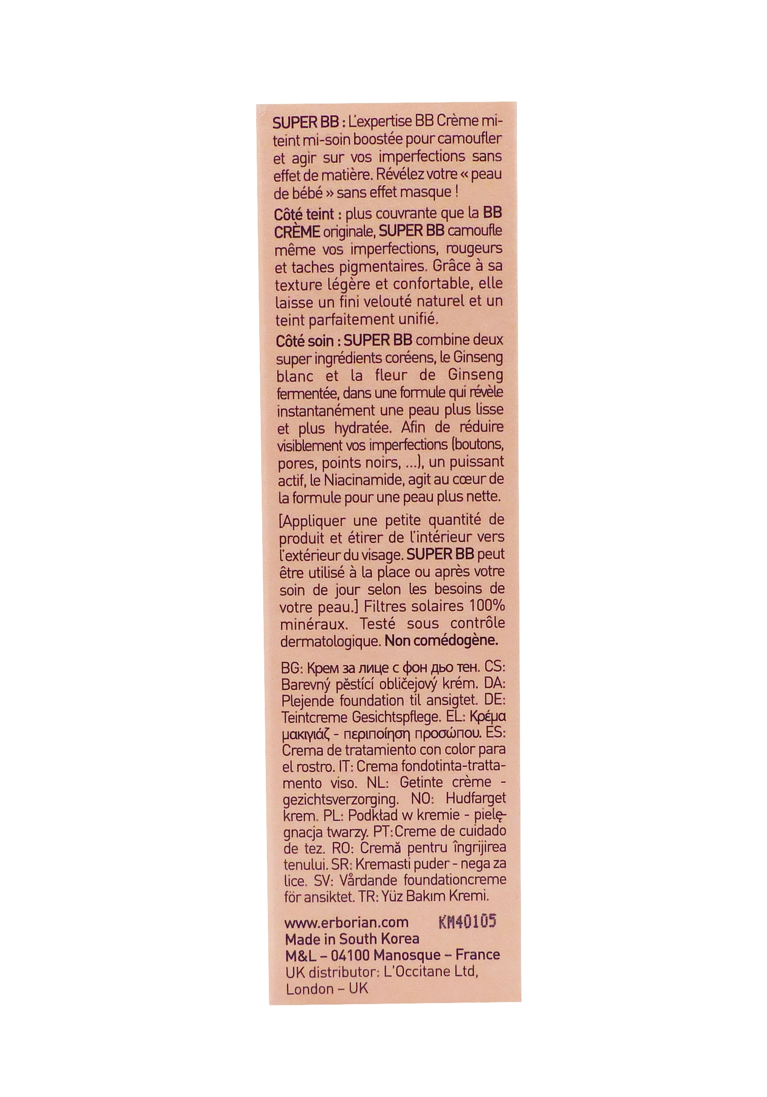 Erborian Super BB Concealer SPF 25 Clair 10 ml est un anti‑cernes qui allie soin et maquillage. Conçu pour camoufler efficacement cernes, imperfections et zones d’ombre tout en unifiant le teint, il offre une couvrance modulable élevée sans effet masque. Enrichi en ingrédients inspirés de la cosmétique coréenne et doté d’un SPF 25, il protège également la zone fragile du contour de l’œil contre les dommages photo‑induits. Sa teinte Clair est idéale pour les peaux claires à claires rosées, apportant un effet lumineux naturel.