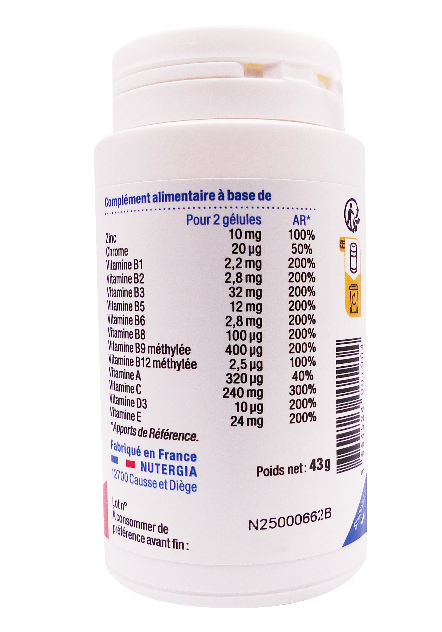 Excipients : Anti-agglomérants (phosphate de calcium, sels de magnésium d’acides gras), agent de charge (mono/diglycérides d’acides gras), gélule végétale (hydroxypropylméthylcellulose ou pullulan).