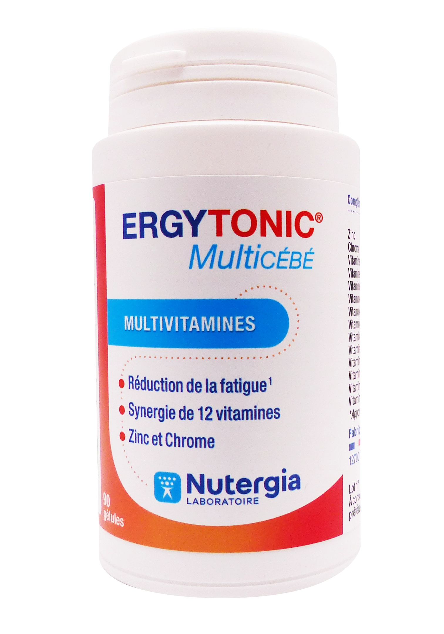 Ergytonic Multicébé 90 gélules Nutergia est un complément alimentaire en gélules végétales, formulé pour combattre la fatigue, soutenir la vitalité et compenser les besoins accrus en vitamines et minéraux lors de périodes de baisse de tonus, stress ou fatigue chronique. Il associe 12 vitamines (A, groupe B, C, D, E), du zinc et du chrome dans des formes bio-disponibles, avec une source naturelle de vitamine C via l’acérola, pour une action globale sur l’énergie et le métabolisme.