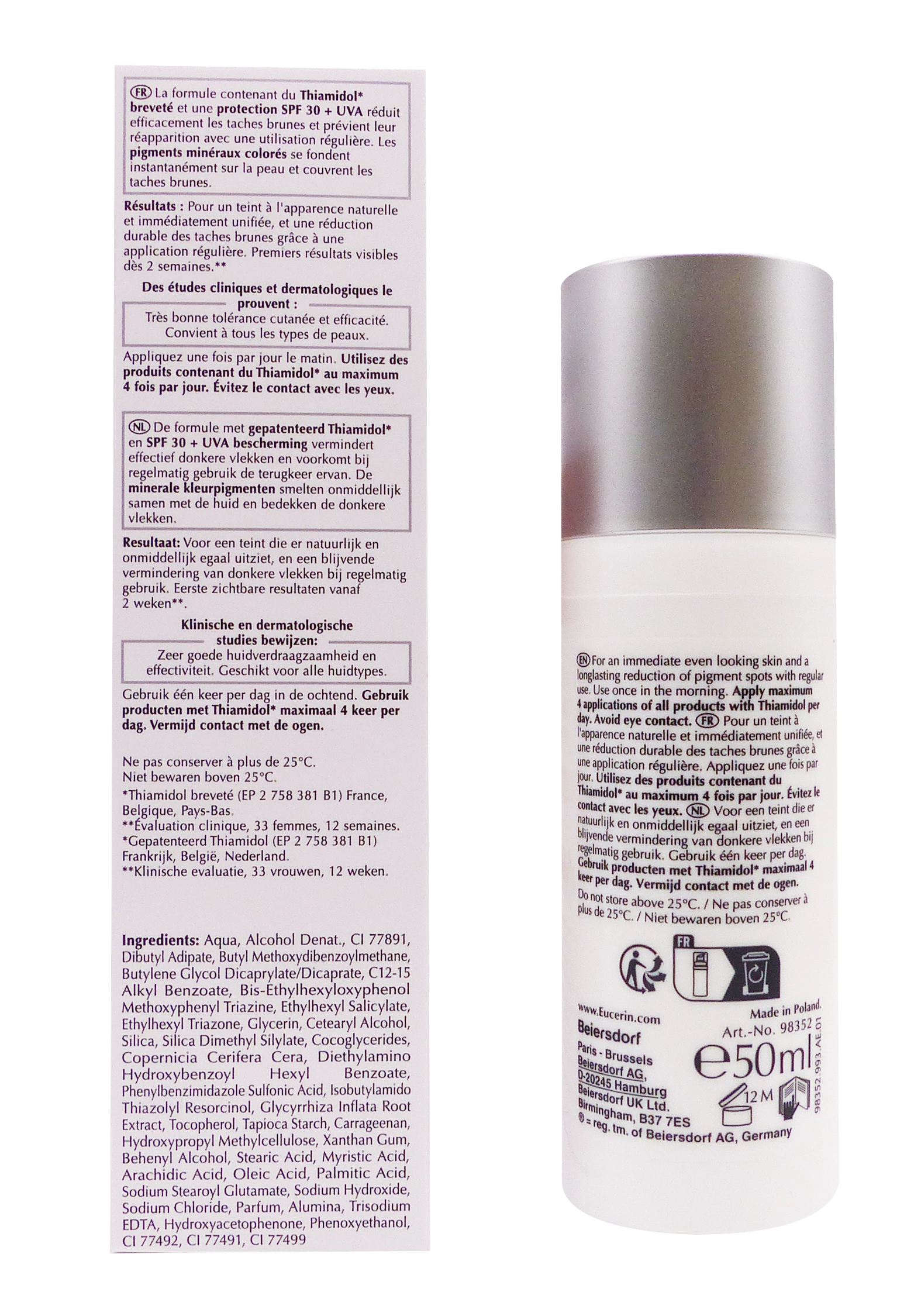 Ce soin combine l’action du célèbre actif Thiamidol®, innovant et breveté par Eucerin, reconnu pour son efficacité à réduire la production excessive de mélanine qui engendre les taches brunes et les décolorations inesthétiques. En inhibant la synthèse de cette mélanine à sa source, le soin aide à atténuer les taches pigmentaires existantes et prévient leur réapparition pour un teint visiblement plus homogène.