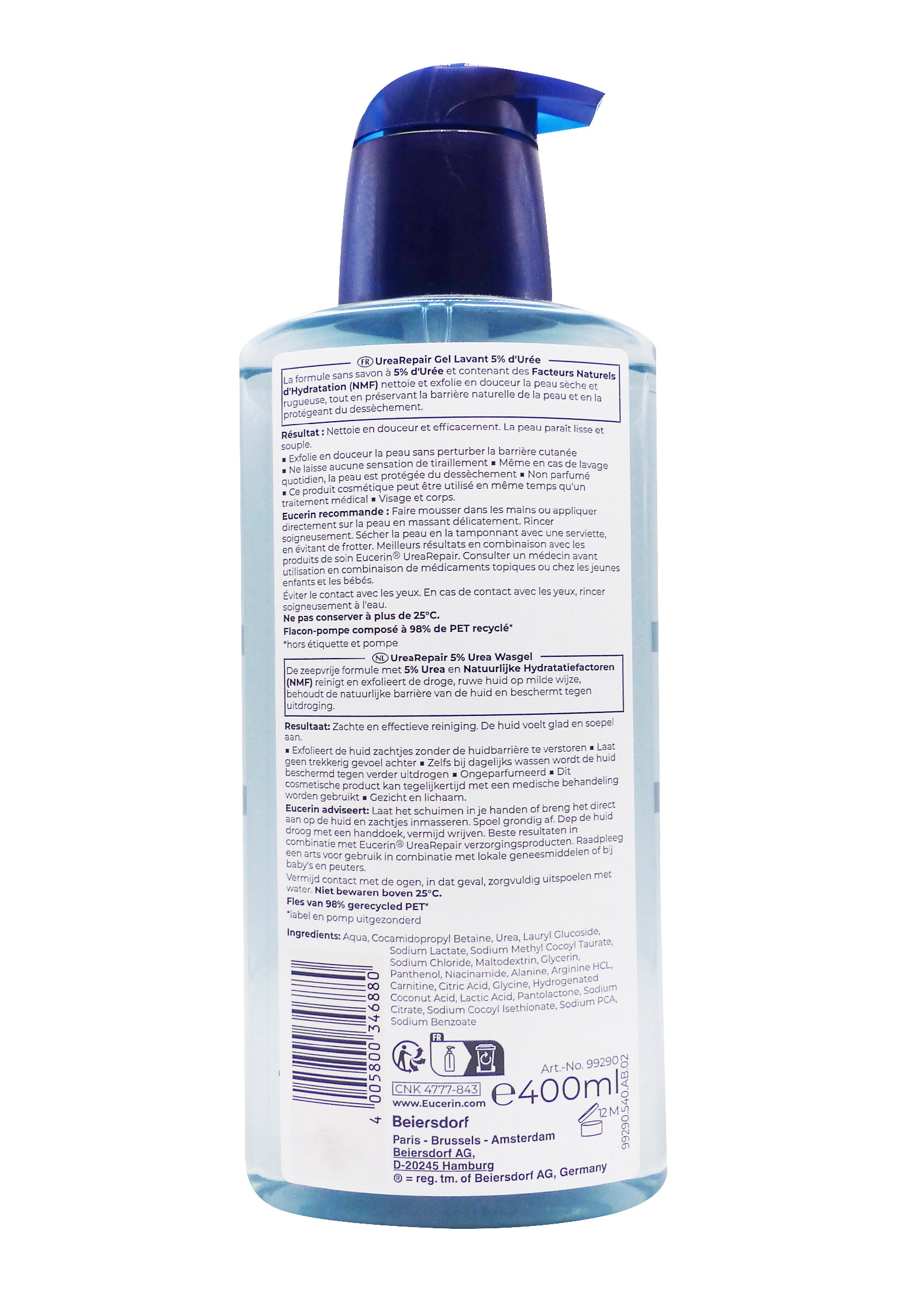 Eucerin Urea Repair Gel Lavant 5% d’Urée 400 ml est un gel nettoyant doux spécialement conçu pour les peaux très sèches à rugueuses, souvent sujettes aux sensations de tiraillements et de démangeaisons. Issu de la gamme dermatologique Eucerin, ce gel lavant sans savon associe la puissance hydratante de l’urée à 5%, un facteur naturel d’hydratation (NMF), à une base lavante très douce qui nettoie efficacement sans agresser la barrière cutanée.