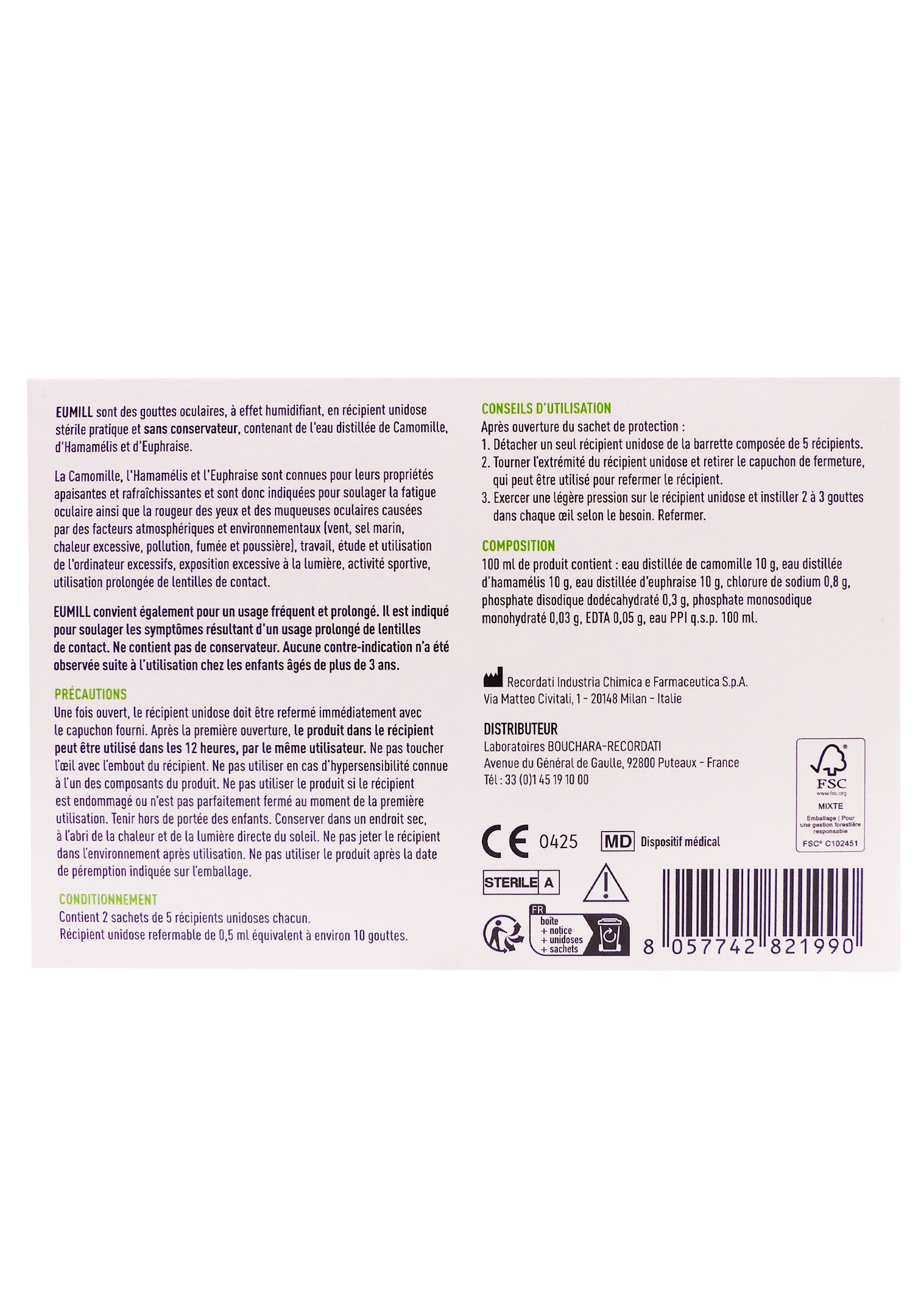 Eumill Yeux Rouges & Irrités 10 unidoses de 0,5 ml est un collyre végétal stérile en format unidoses, formulé pour apaiser et rafraîchir les yeux rouges, irrités ou fatigués, dus à des agressions comme le vent, la pollution, le chlore, les écrans ou le maquillage. Sa solution combine des eaux distillées de camomille, hamamélis et euphraise pour une action décongestionnante et calmante immédiate, sans conservateurs ni vasoconstricteurs, restaurant le confort oculaire et protégeant contre l’évaporation lacrymale. Convient dès 3 ans, compatible lentilles de contact, ce dispositif médical offre une hygiène optimale avec des récipients à usage unique ou conservables 12h maximum.