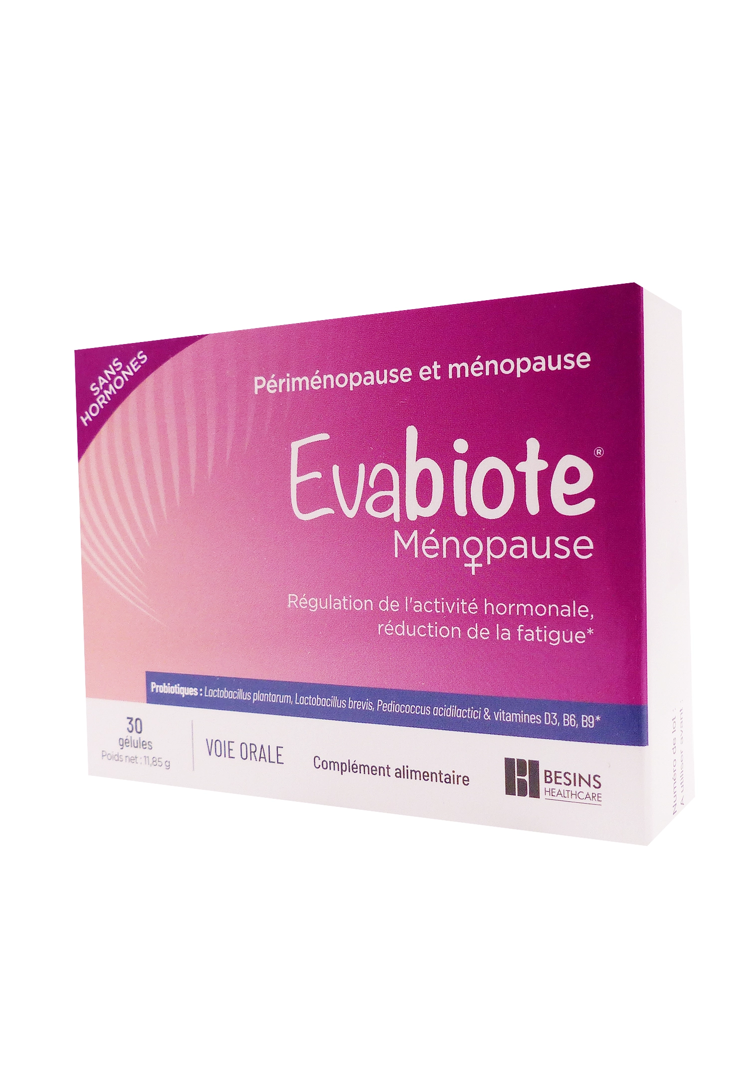 Evabiote Ménopause 30 gélules est un complément alimentaire sans hormones, spécialement formulé pour accompagner les femmes durant la périménopause et la ménopause. Il associe trois souches probiotiques spécifiques à des vitamines ciblées (B6, B9, D3) pour soutenir l’équilibre du microbioteintestinal, réduire la fatigue et favoriser le bien-être hormonal et psychologique. Prise en une gélule quotidienne, cette cure de 30 jours aide à atténuer les inconforts comme les bouffées de chaleur, les sautes d’humeur et la fatigue chronique.