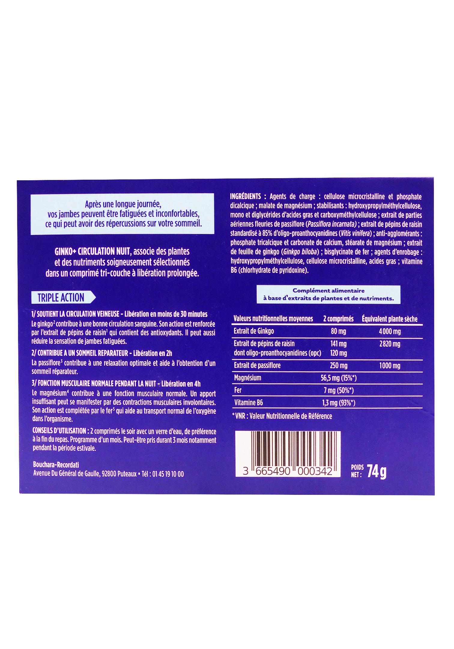 • Triple action : circulation immédiate (ginkgo, pépins de raisin), relaxation nocturne (passiflore) et réduction de fatigue (magnésium, fer, B6).