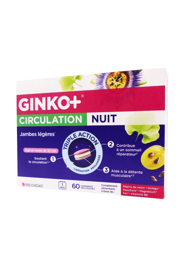 Ginko+ Circulation Nuit 60 comprimes est un complément alimentaire à libération prolongée en 3 couches, formulé pour favoriser la circulation veineuse et obtenir des jambes légères tout en améliorant le sommeil réparateur. Sa première couche agit immédiatement sur la circulation grâce au ginkgo biloba et aux pépins de raisin riches en OPC, tandis que la seconde (libérée après 2h) favorise la relaxation via la passiflore, et la troisième soutient la détente musculaire avec magnésium, fer et vitamine B6. Boîte de 60 comprimés pour 1 mois, il cible particulièrement les sensations de jambes lourdes en fin de journée.