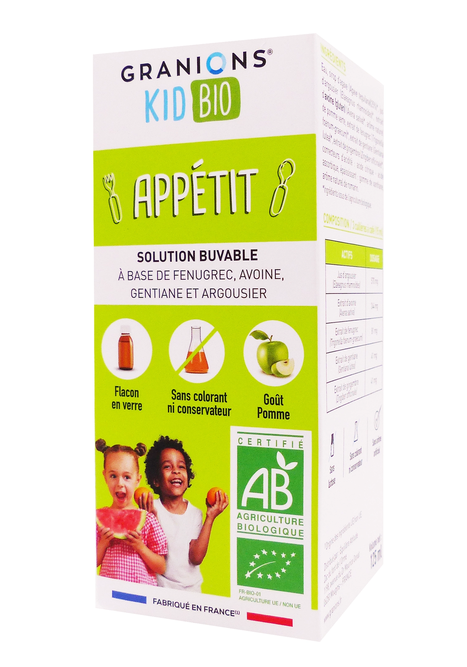 Granions Kid Bio Appétit solution buvable 125 ml est un complément alimentaire en sirop certifié bio, au goût pomme, spécialement formulé pour aider les enfants à retrouver un appétit plus régulier, tout en soutenant une bonne digestion. Il associe plusieurs extraits de plantes biologiques reconnues pour stimuler l’appétit et soutenir le système digestif (avoine, gentiane, fenugrec, gingembre), avec un sirop d’agave bio comme base sucrée, sans sucres ajoutés, sans colorant ni conservateur, ce qui le rend adapté aux enfants ayant des difficultés alimentaires ponctuelles. Ce produit s’utilise en complément d’une hygiène alimentaire et d’un rythme de repas structuré, sans remplacer le repas ni le suivi médical en cas de maigreur, de refus persistant ou de pathologie sous‑jacente.