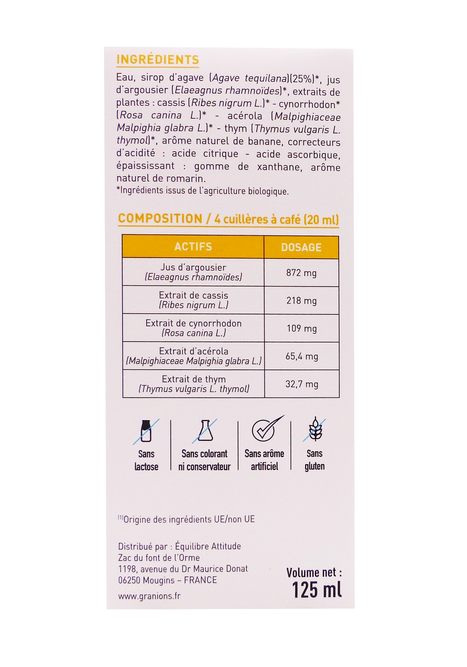 • Extrait de cassis bio (Ribes nigrum) : environ 218 mg, source de flavonoïdes et de proanthocyanidols, contribuant à la tonicité et à la résistance physiologique.