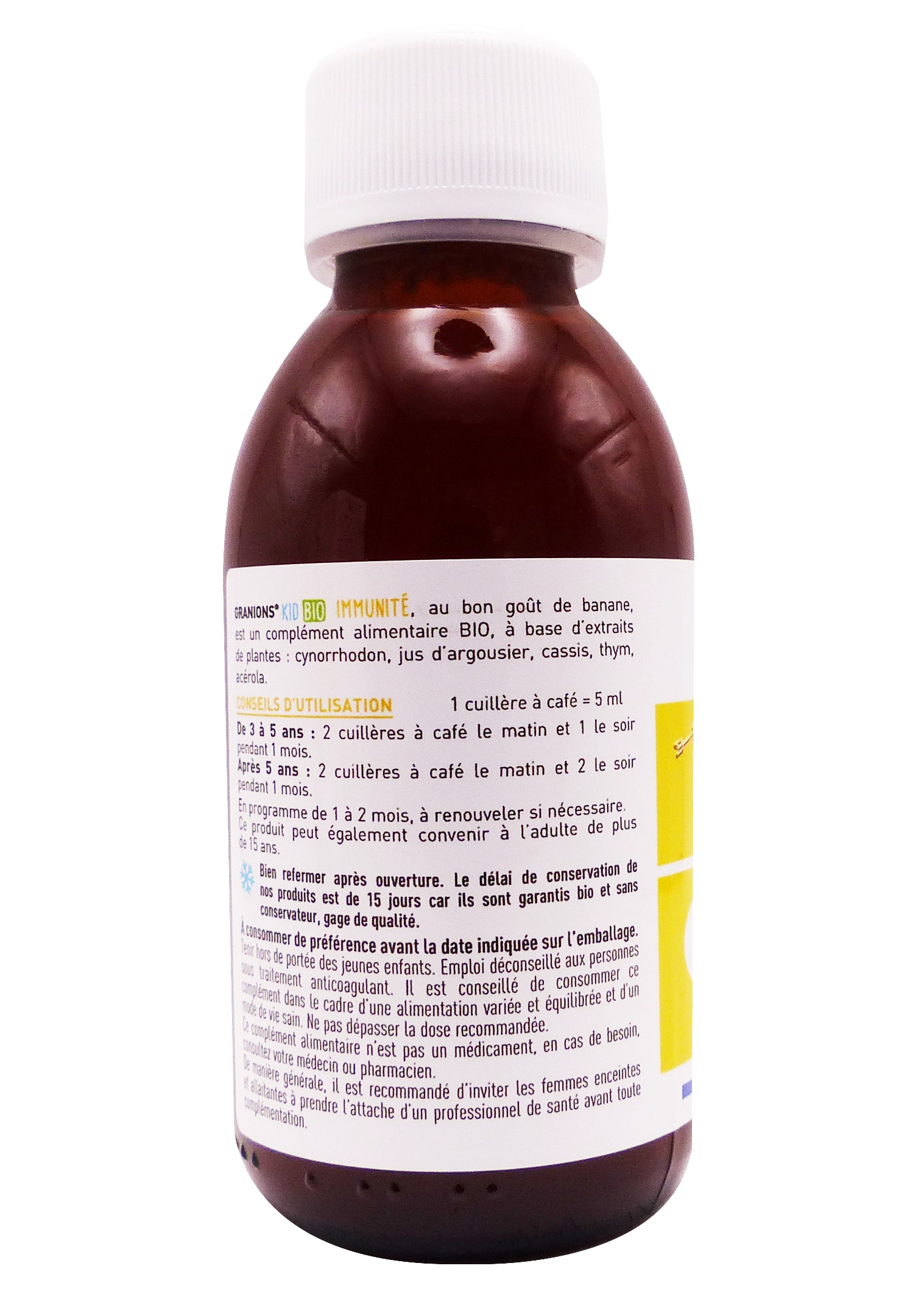 • Quantité recommandée du sirop Granions: en général, 1 à 2 dosettes de 20 ml (soit 4 cuillères à café) par jour pour l’enfant, à prendre de préférence au cours d’un repas, sauf avis contraire d’un professionnel de santé.